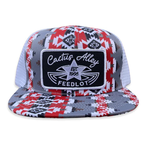Cactus Alley red aztec print with white mesh snapback cap featuring our?”Waylon” patch!