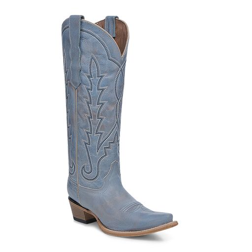 Step into style with the Circle G by Corral Western Leather Boot. This stunning blue leather boot features intricate stitching in a mesmerizing triad pattern, blending traditional Western flair with contemporary elegance.Blue Distressed leather embroidered cowboy boot14″ shaft, snip toe13″ calf circumference2″ heelCushioned insoleLeather Soles