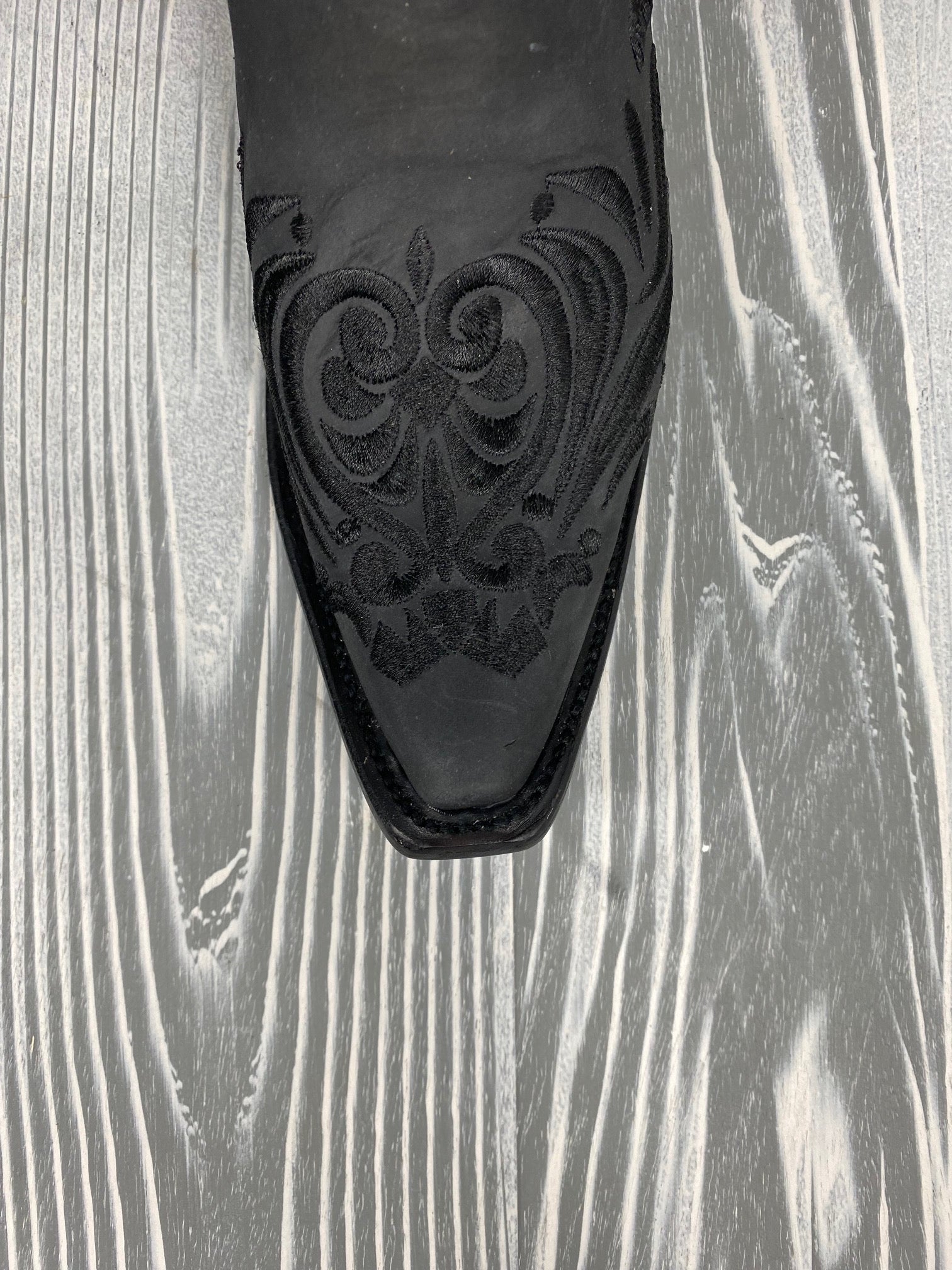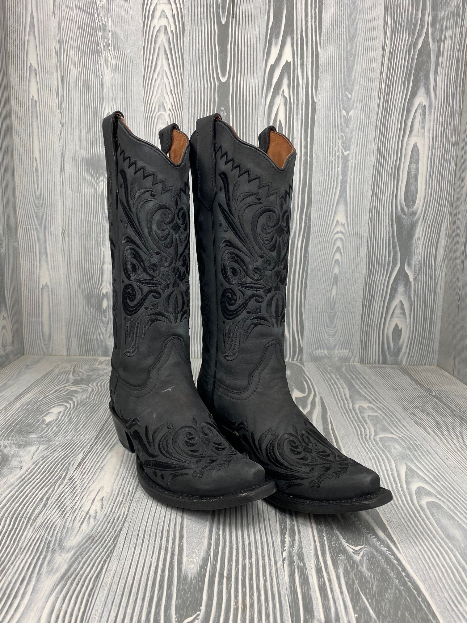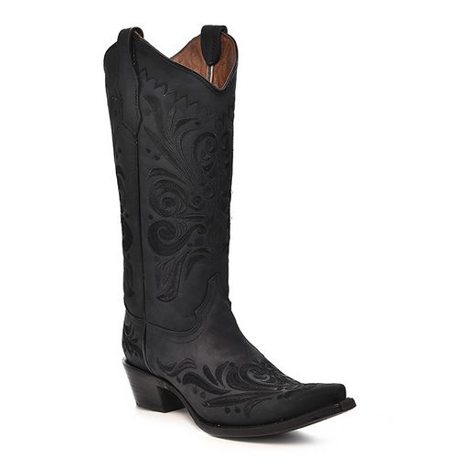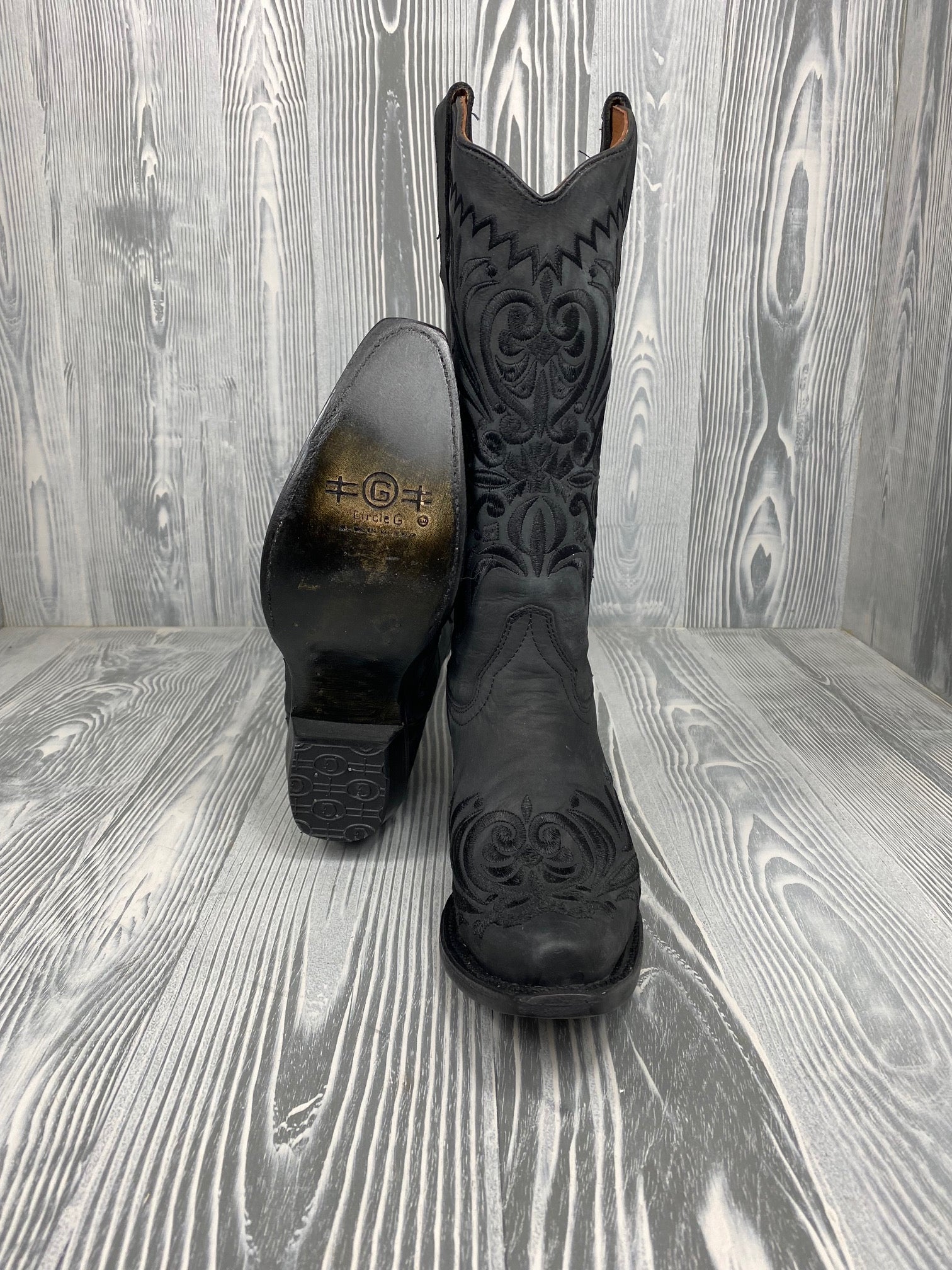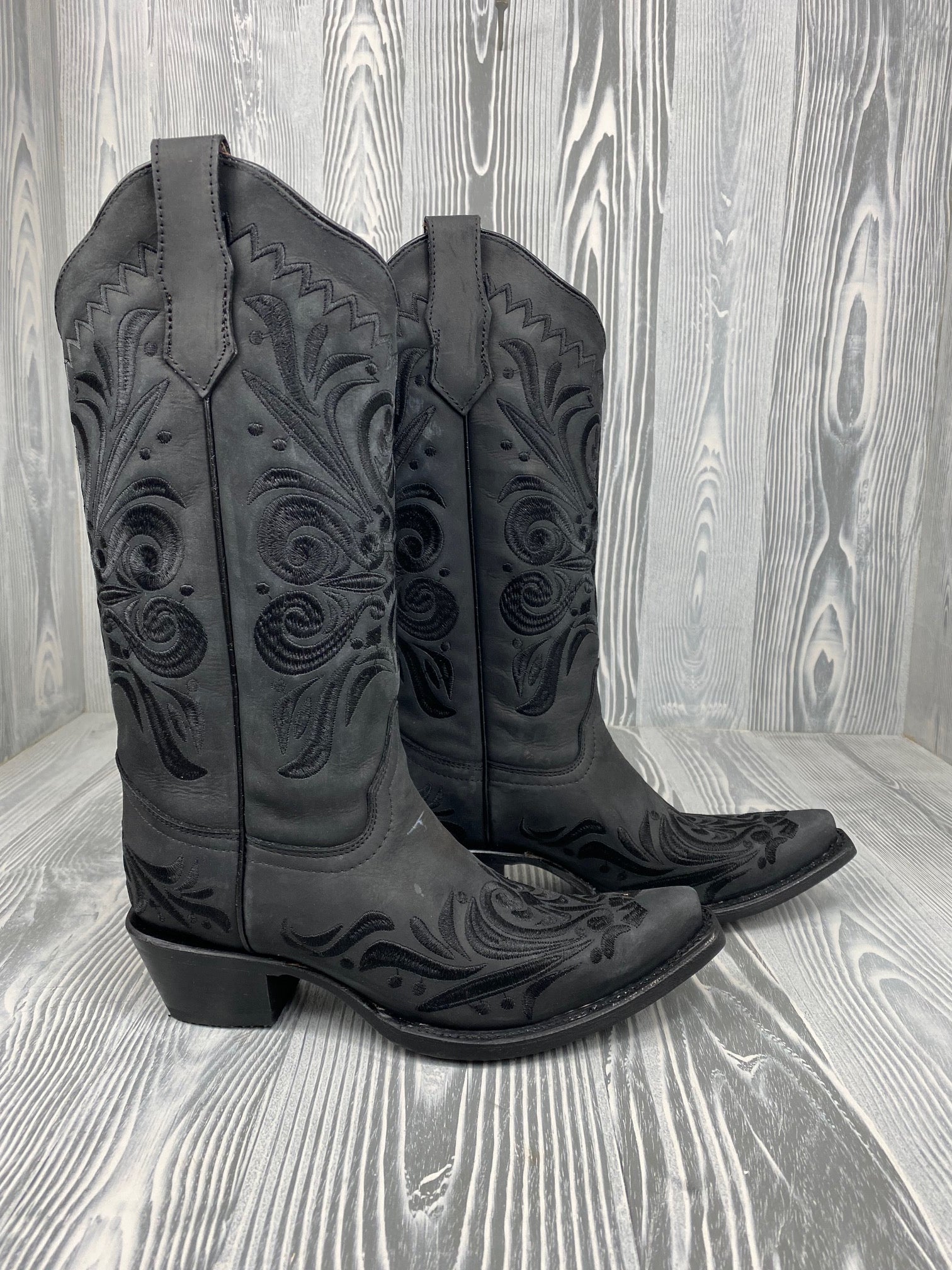 Circle G Women’s Black Filigree Western Boots-L5433?Vamp: Black with Stitching?Top:13″ Black Leather?Snip toeEmbroidered filigree detailingGoodyear welted1 1/2″ western heelLeather outsole