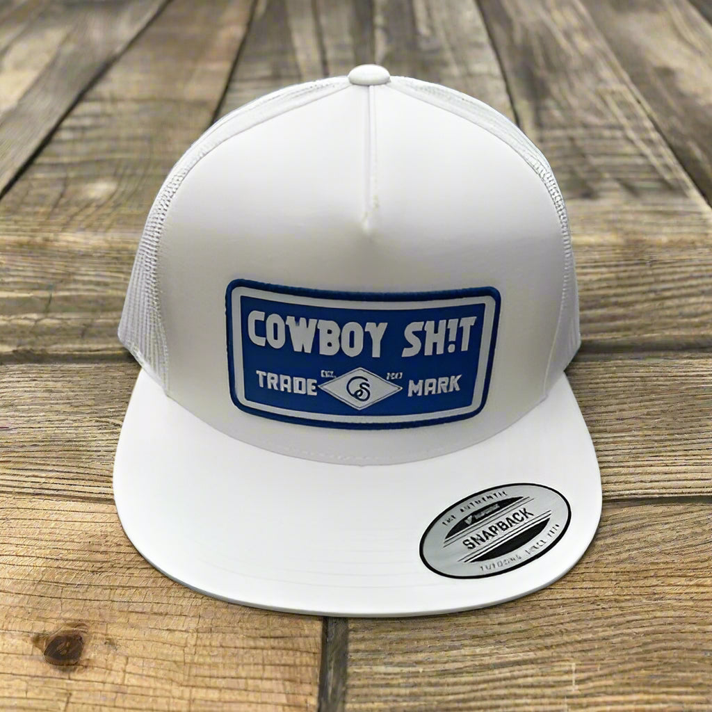 White flat brim Yupoong hat electric blue and white Cowboy Sh!t Trademark patch.