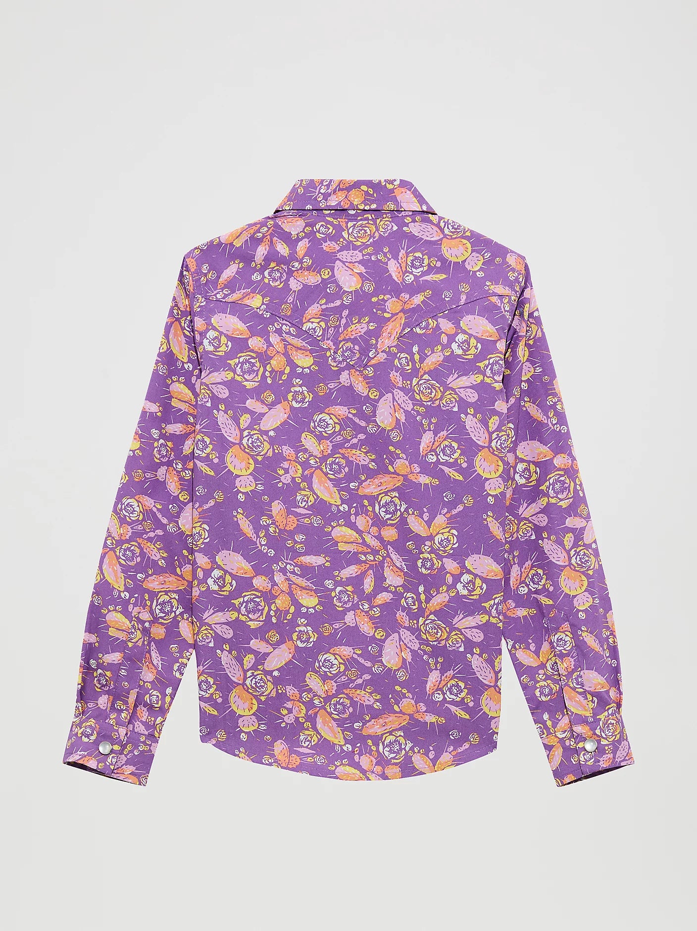 A COWGIRL-FAVORITE WITH A WHIMSICAL TOUCHThis classic Western style is designed with whimsical graphics your little cowgirl will love. The Wrangler? girls’ long-sleeve Western snap shirt is equipped with all the usual details, including pearl snap buttons, ‘W’ pocket stitching, and Western yokes. Intricate cacti spikes and florals decorate this top and help her style stand out.?Sleeve Length:?Long?Front Closure:?Buttons?Front Pockets:?Two with snaps?Cuff:?Single ButtonColor:?Purple Cacti??Product ID:?112364309?Color:?Purple?Fabric:?100% Cotton Poplin?Type:?Cotton?Pattern:?Print