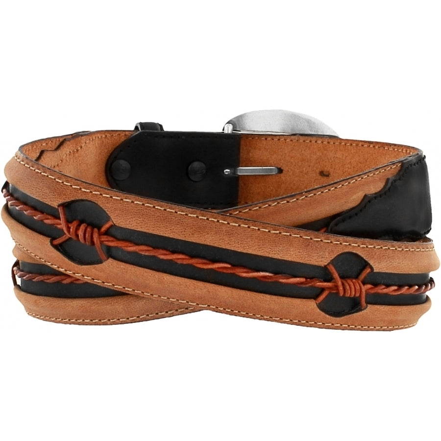 Justin Fenced In ?Style: #C10813Color: Aged Bark1.5″ coffee leather strap, black billet and underlay, cognac kid leather lacing, antiqued polished silver buckle with leather inlay: