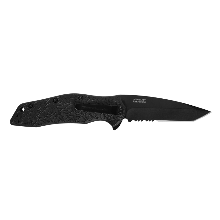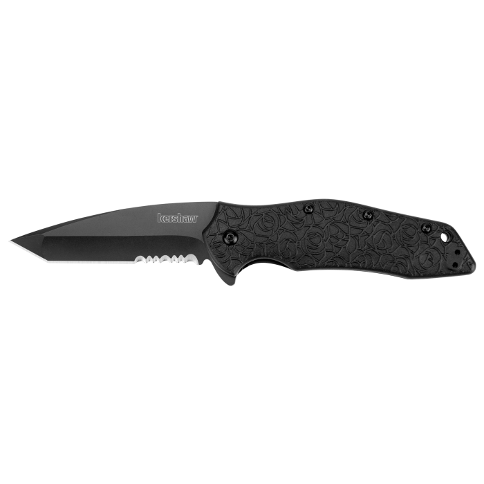 The Kuro??s blade is an Americanized tanto with partial serration and a drop point for strong piercing. The edge provides good slashing capability while the partial blade serration offers versatility for cutting fibrous materials with ease. For speedy, one-handed opening, the Kuro has Kershaw’s assisted opening, accessed with the built-in flipper. The ambidextrous flipper works perfectly for both lefties and righties. The handle scales are glass-filled nylon for durability and dimensional stability, even in temperature extremes. The eye-catching pattern on the scales offers additional grip traction and looks like nothing else.The Kuro offers standout looks??and standout function8Cr13MoV blade steel offers edge-holding capability, strength, and hardness; black-oxide coating adds blade protectionLightweight, strong glass-filled nylon handleFast, easy opening with Kershaw’s assisted opening and flipper3-position pocketclipFEATURES + DETAILSUse?EverydayType?Assisted, FolderStyle?PocketknifeDesigner?Kershaw OriginalsBlade Style?American TantoBlade Edge?Partially SerratedOpening Action?AssistedOpens With?FlipperLock Type?Liner lockPocketclip?3-position (right/left, tip-up; right, tip-down)Handle Color?BlackHardware?Glass-filled nylon backspacer, steel screwsSheath??CCountry of Origin?USA: Design, Prototype, Quality Control. China: ManufactureWarranty?Limited Lifetime Warranty with Kershaw, NOT Nigro’s Western Store