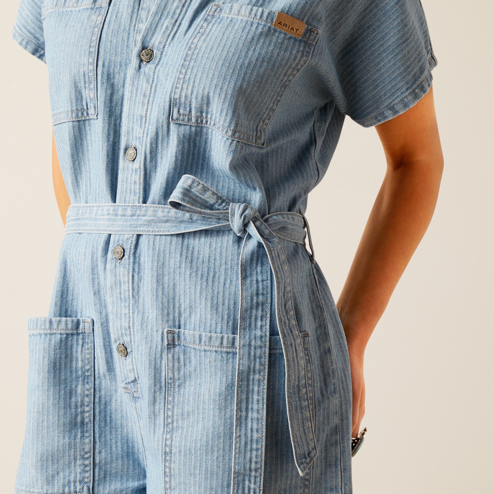 Summer dressing made easy. This one-and-done romper can look low-key cute with sneakers or festival-ready with boots. Herringbone fabric gives it a subtle railroad stripe, while the removable, self-tie belt lends a feminine feel.Hidden button placketRemovable Tie Waistband?5″ Inseam With CuffHerringbone Denim100% Cotton