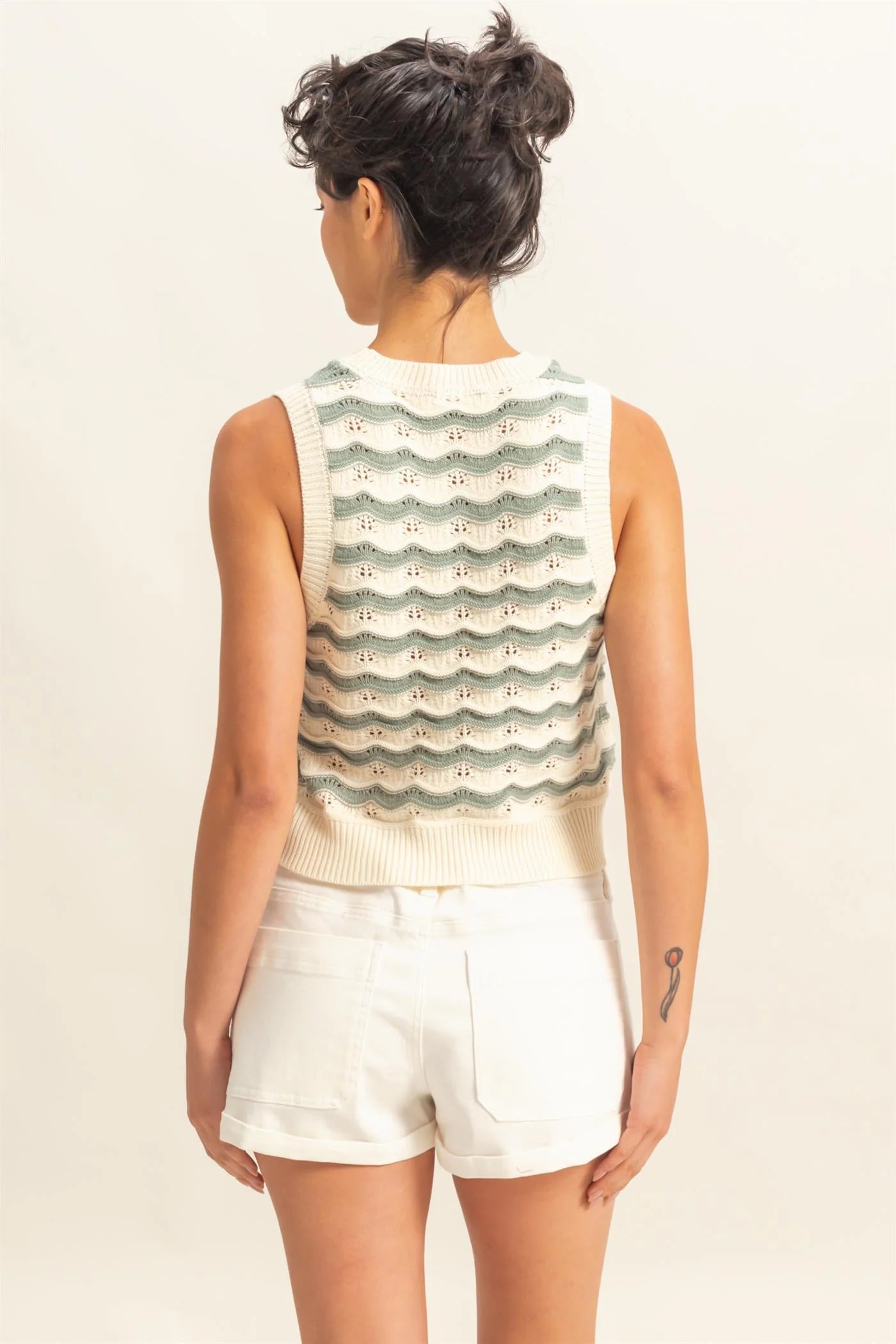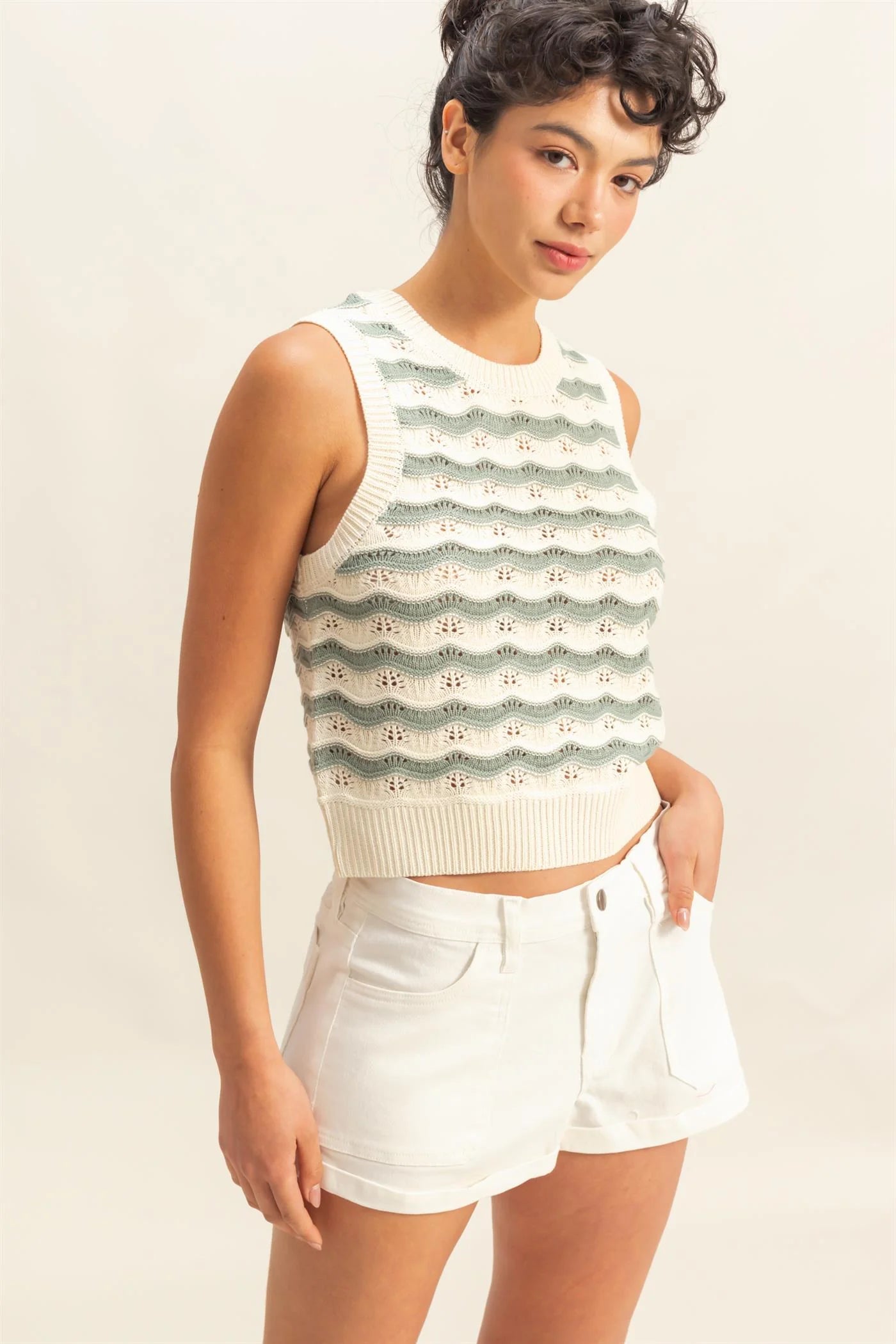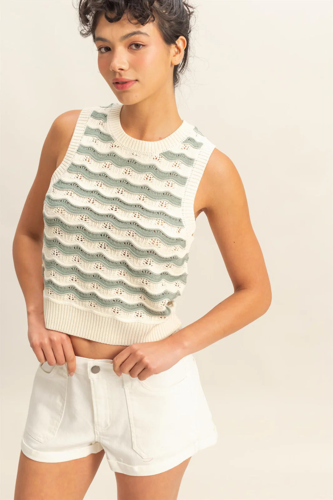 Tops Like These Are A Must-Have For The Warmer Months. Crafted From Knit, This Top Has A Wavy Pattern And Forms A Sleeveless Bodice. Ribbed Detailing Is Featured Along The Neckline, Arm Holes And Hem.100% Acrylic