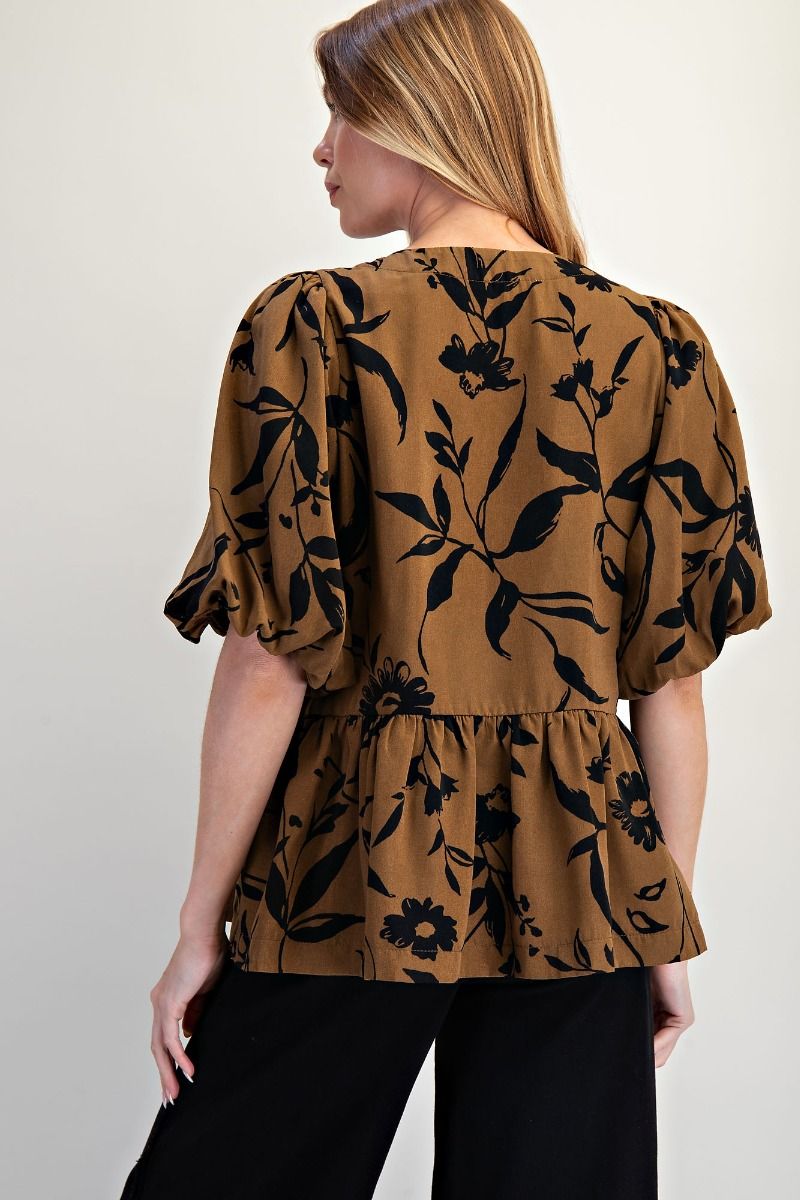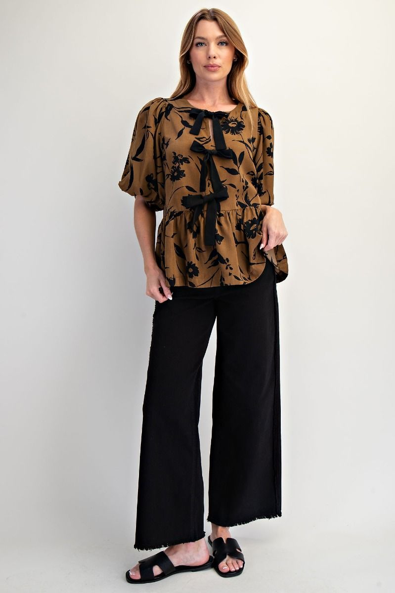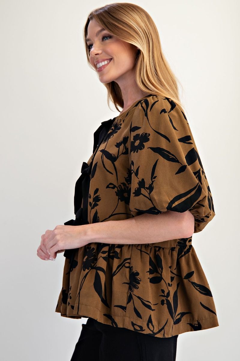BOW FRONT WOOL PEACH TOP-SHORT PUFF SLEEVES-THREE BOW TIE CLOSURES-ROUND NECKLINE-EMPIRE WAIST SEAM-FLARED PEPLUM-LOOSE FITTING BODICE