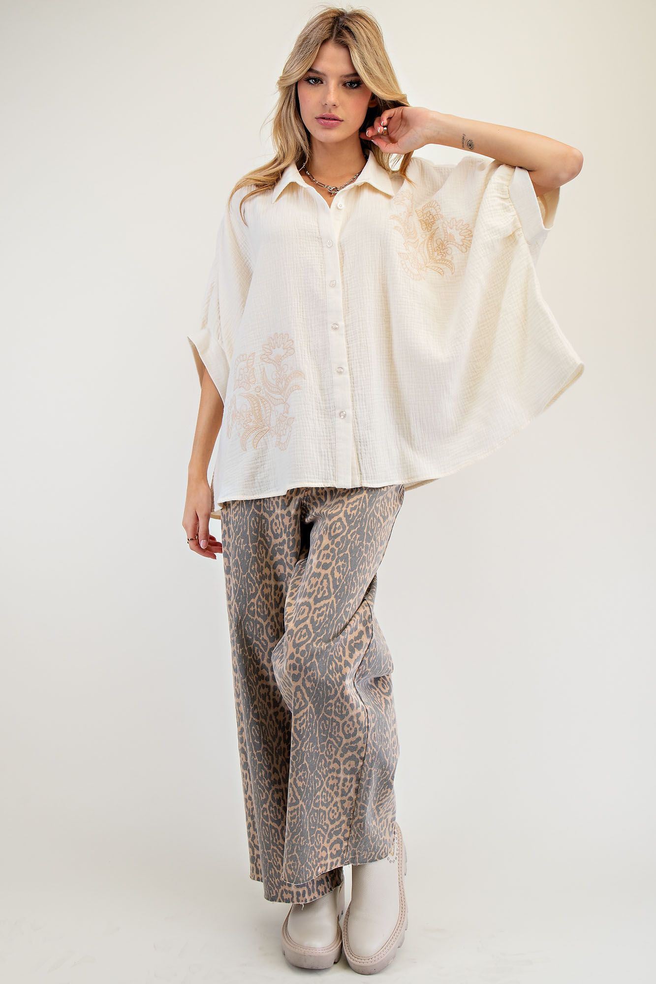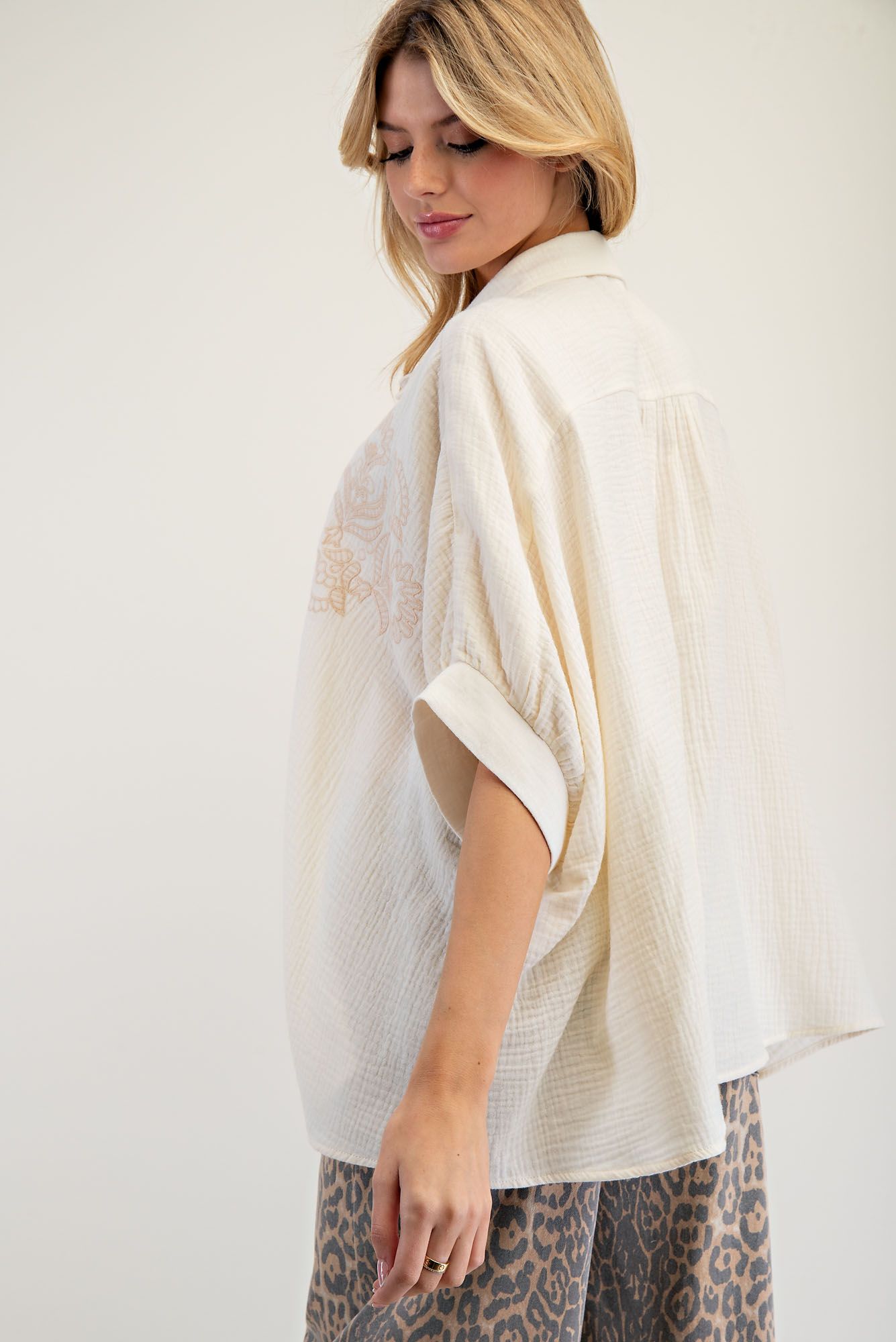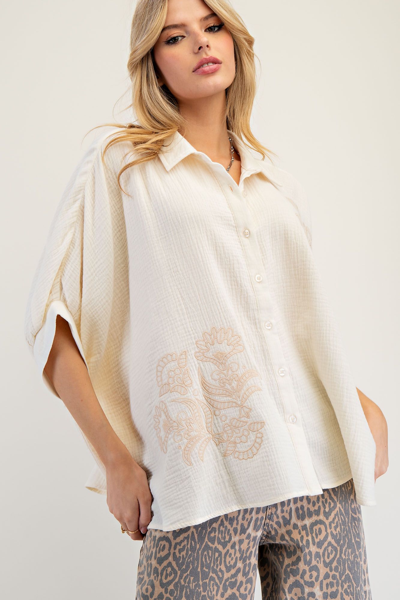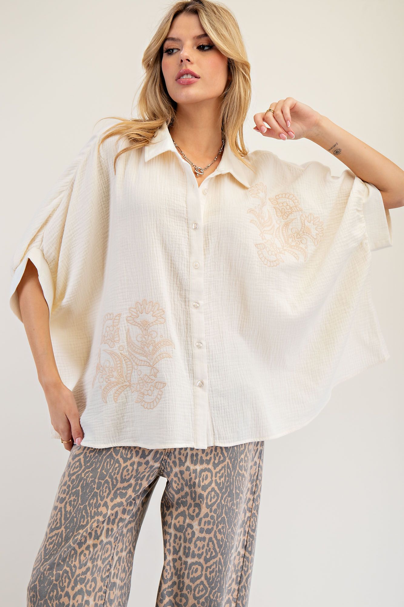 Ladies Easel Cotton Guaze Embroidered Button Down Shirt – ET25618