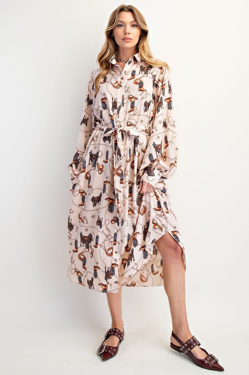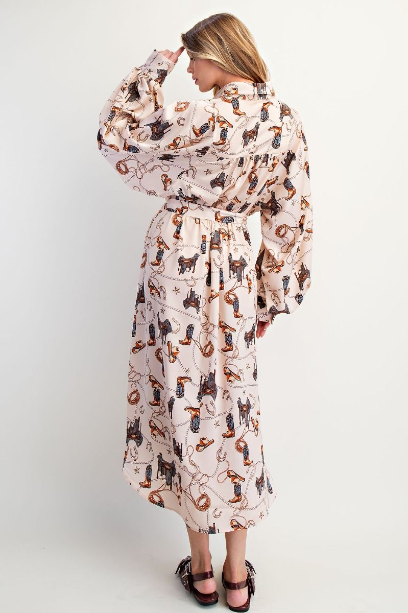 BUTTON-DOWN SHIRT DRESS STYLECOLLARED NECKLINELONG BALLOON SLEEVES WITH CUFFED BUTTONED WRISTSREMOVABLE SELF TIE BELTSIDE POCKETSCAN BE STYLED OPEN AS A KIMONORELAXED, OVERSIZED FITPERFECT FALL DRESSES100% POLYESTER