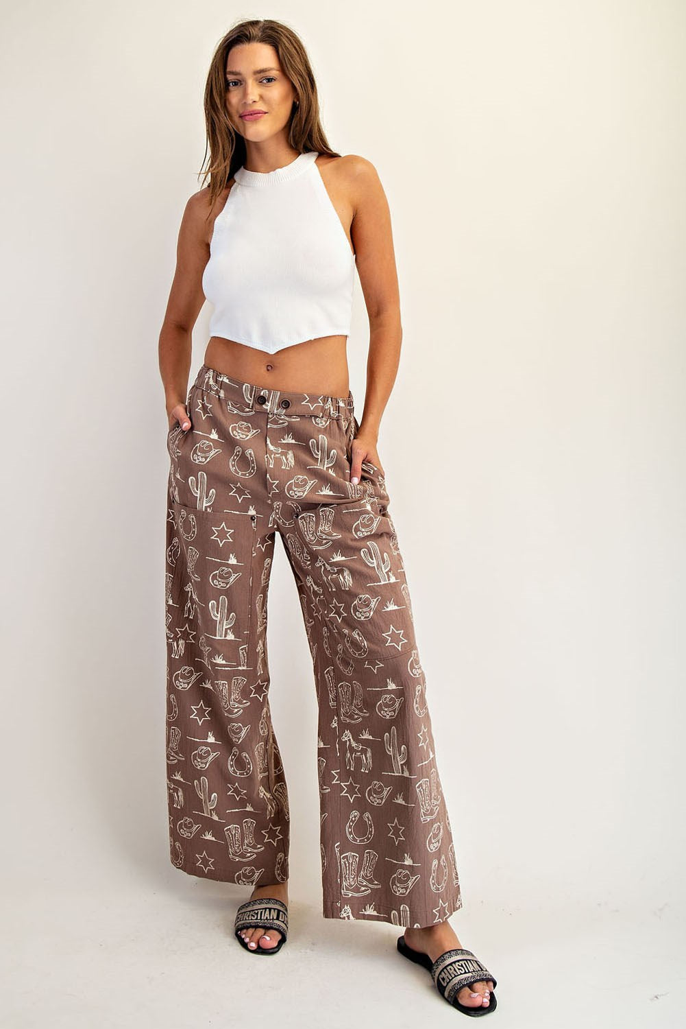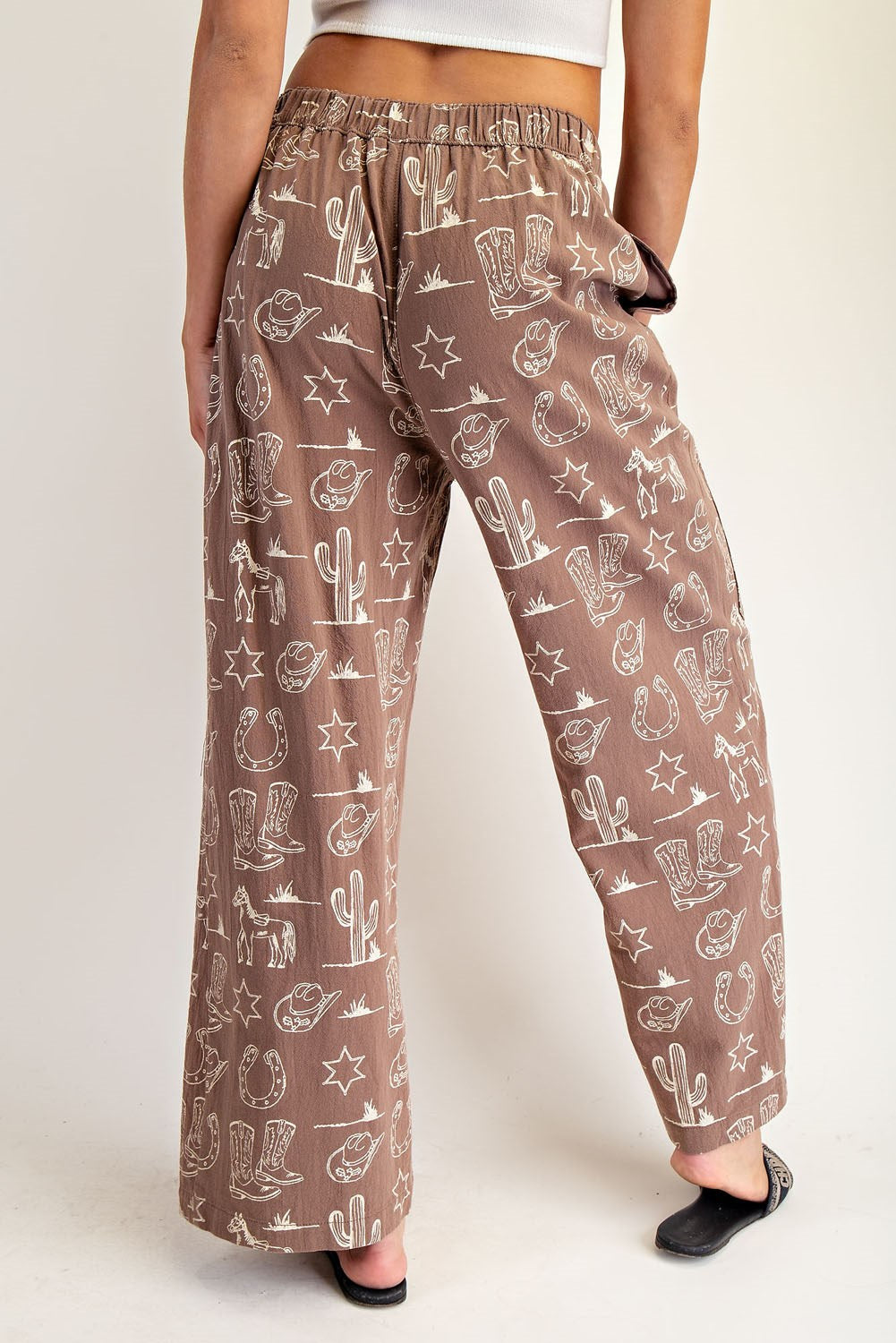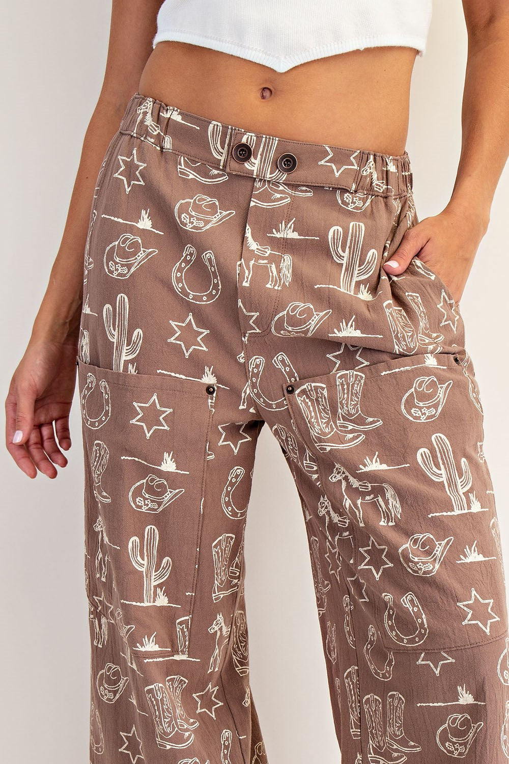 These stone washed pants feature a playful allover Western inspired print, oversized patch pockets with rivet detailing, a partial elastic waistband with double button front closure, and a relaxed straight leg silhouette for an easygoing, statement making look.100% Cotton