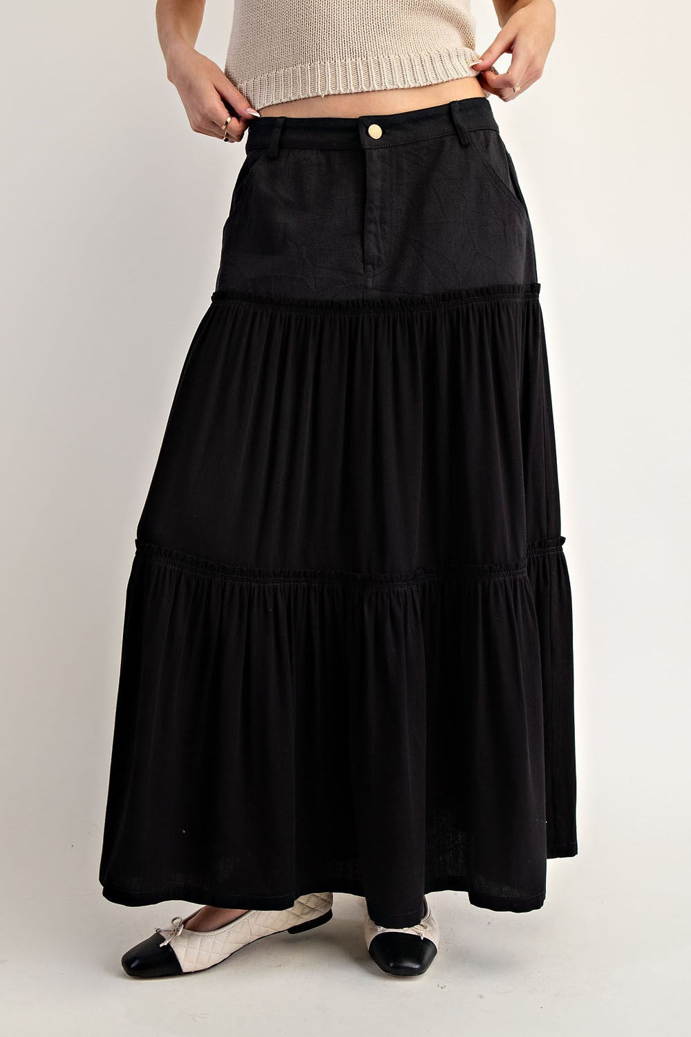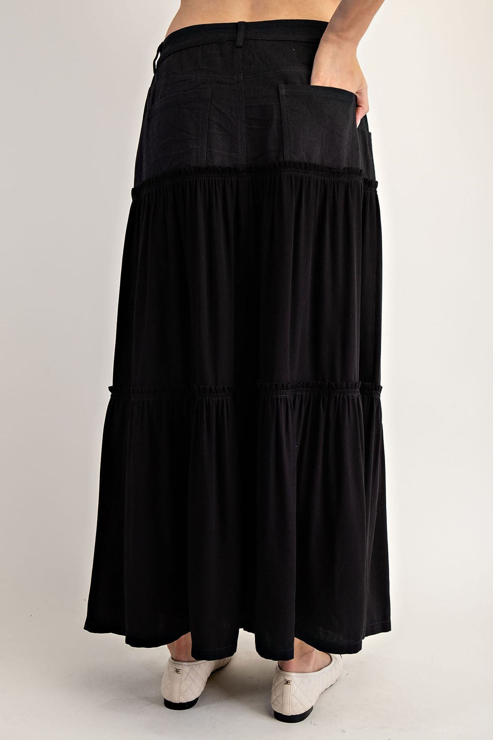 This tiered maxi skirt features a structured denim inspired waistband with belt loops, front button and zip fly, utility style patch pockets, and soft gathered panels with ruched seam detailing for a flowy, lived in look that blends structure with ease.100% RAYON 100% COTTON