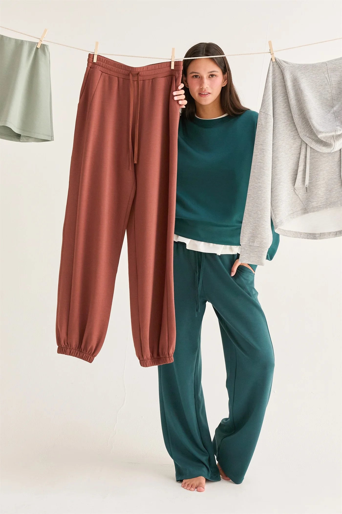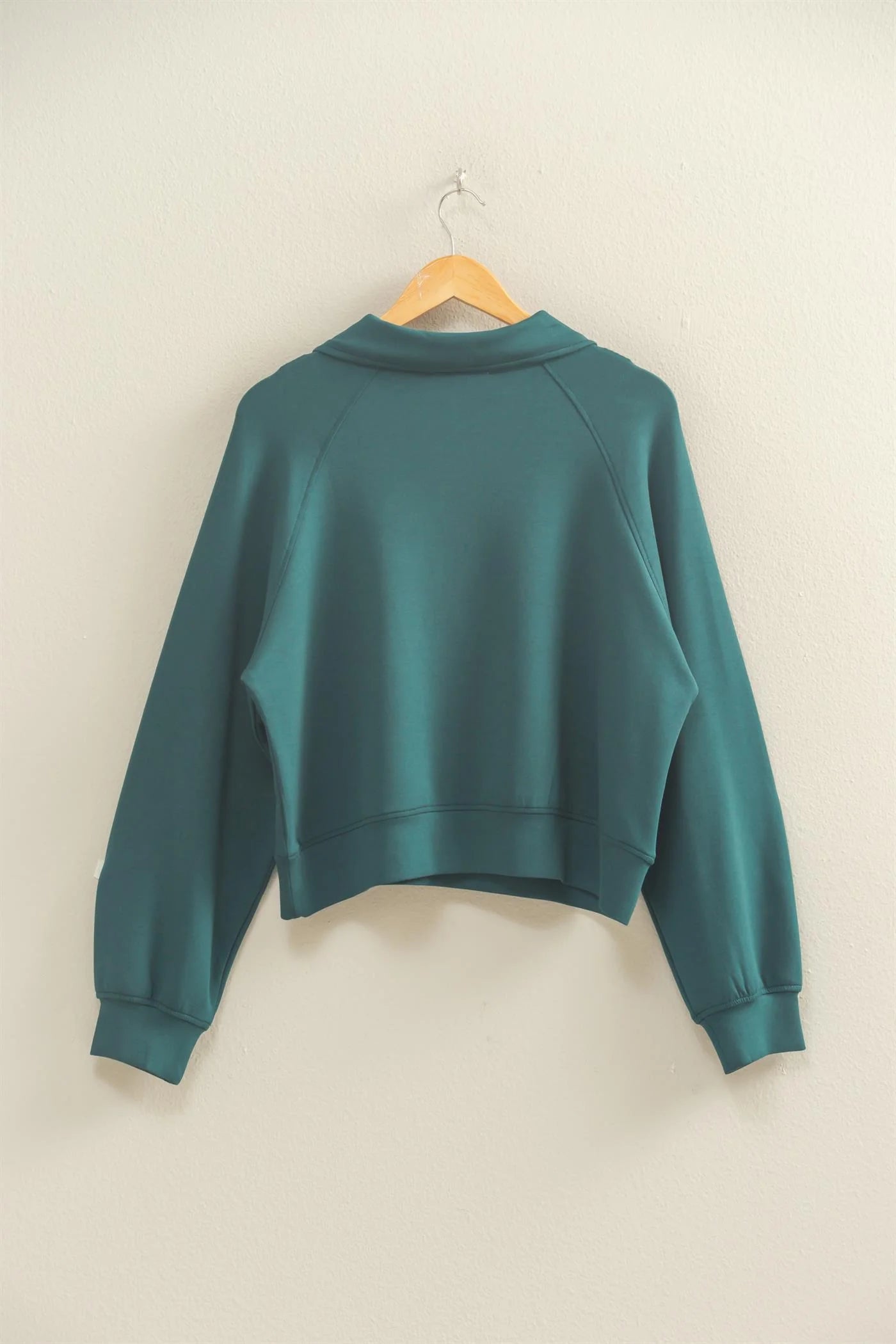 Stay Comfortable And Stylish With This Zip-Up Collar Sweatshirt. Featuring A Front Zipper Closure And A Classic Collar, This Sweatshirt Offers A Relaxed Fit With A Modern Twist. The Raglan Sleeves And Kangaroo Pocket Add Functionality, While The Ribbed Hem And Cuffs Ensure A Snug Fit. Perfect For Layering Or Wearing On Its Own For A Casual, Chic Look.Experience Ultimate Comfort And Style With These Wide-Leg Drawstring Sweatpants. Designed With A Relaxed Fit, These Sweatpants Feature A Drawstring Waist For A Customizable Fit And Convenience. The Wide-Leg Cut Provides Ample Room For Movement, Making Them Perfect For Lounging Or Casual Outings. Crafted From A Soft, Cozy Fabric, These Sweatpants Ensure All-Day Comfort While Maintaining A Chic And Trendy Look. Pair Them With A Crop Top Or Hoodie For A Laid-Back Yet Fashionable Ensemble. A Must-Have For Any Wardrobe, Blending Functionality And Fashion Seamlessly.Deep Green46% Rayon 47% Polyester 7% Spandex