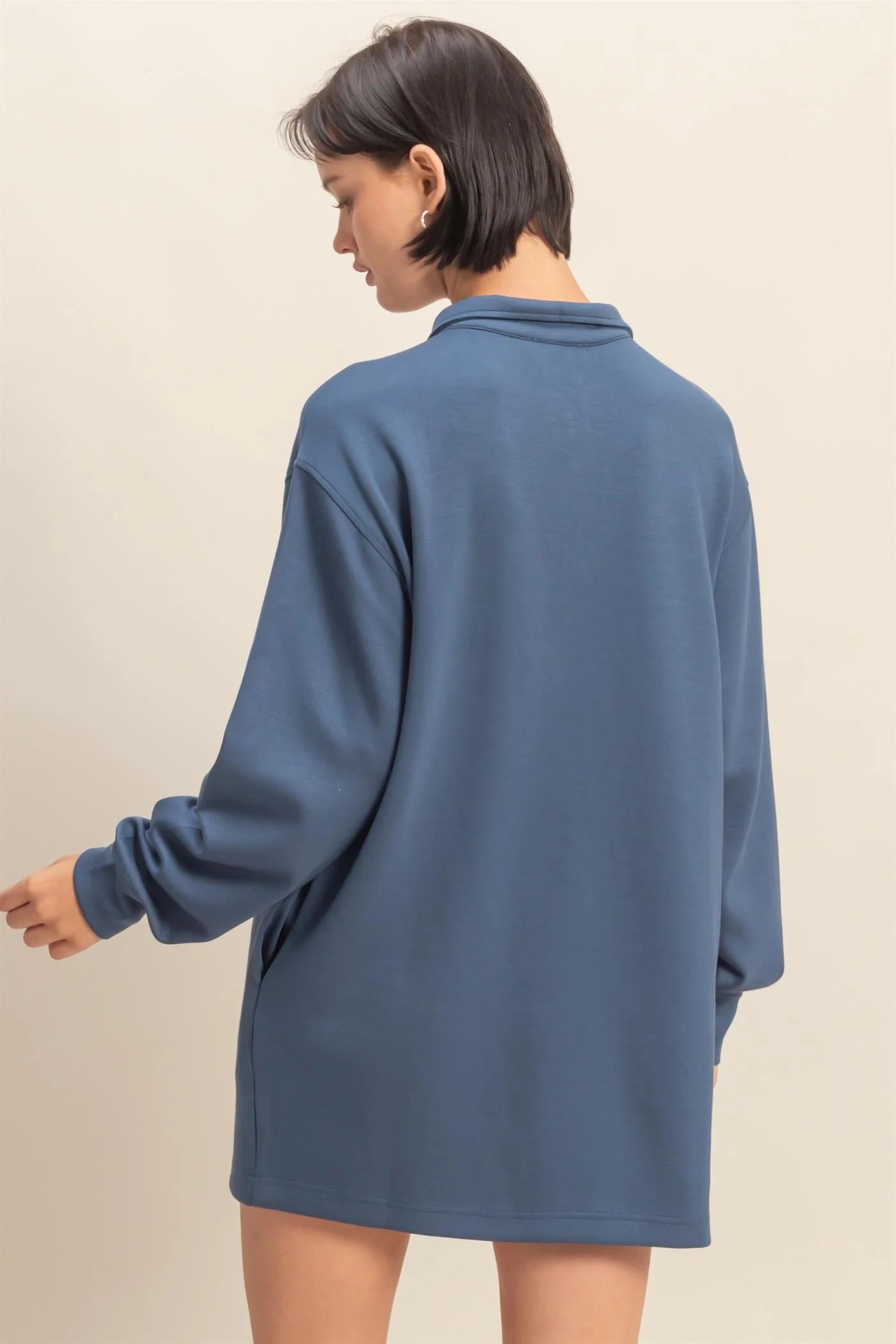 This dress will be your go-to for casual days. Soft scuba fabric shapes this piece that has a high neckline leading to half zip-up cut. The long sleeves come with drop shoulders as the dress shapes a loose silhouette with a mini hem and side pockets.55% cotton 40% polyester 5% spandex