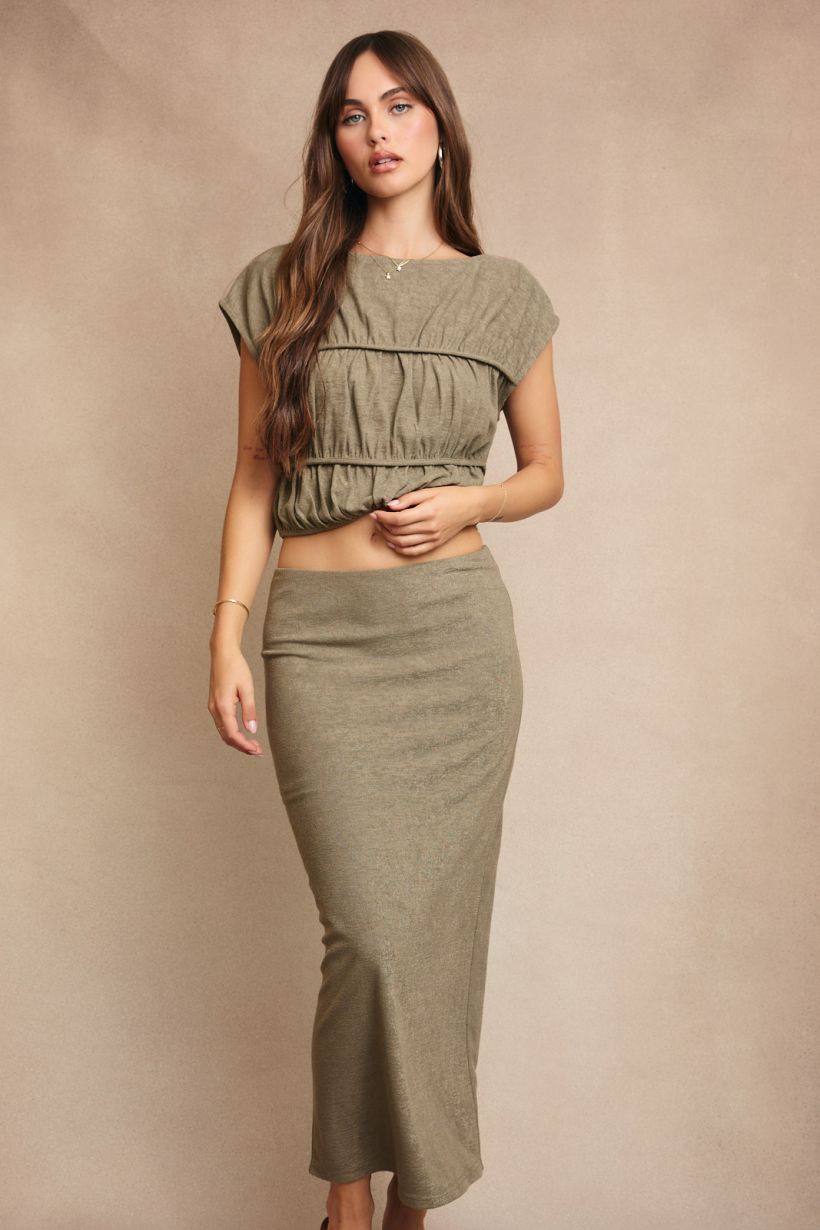 BOAT NECK SHIRRING DETAIL TOP WITH MIDI SKIRT