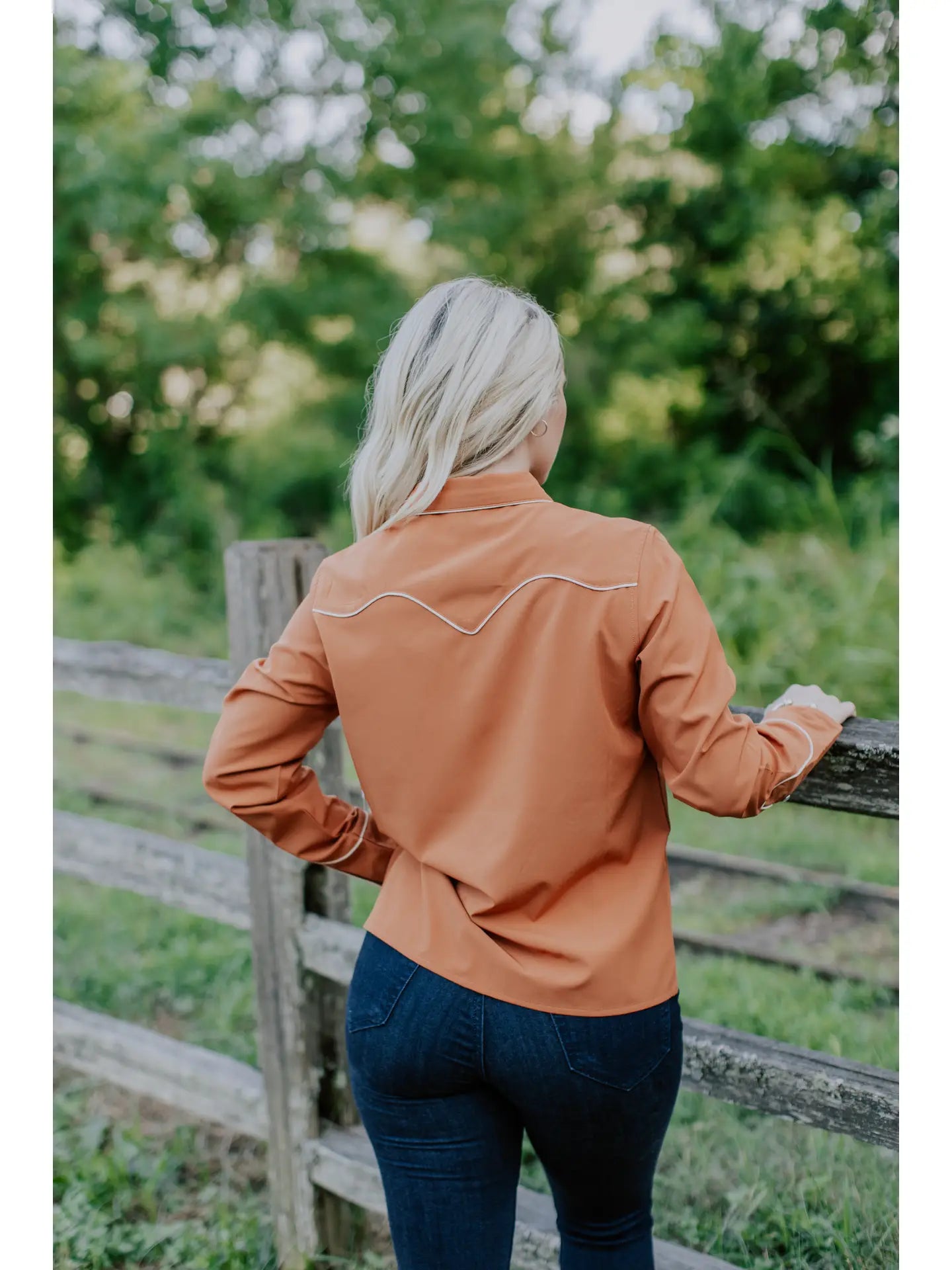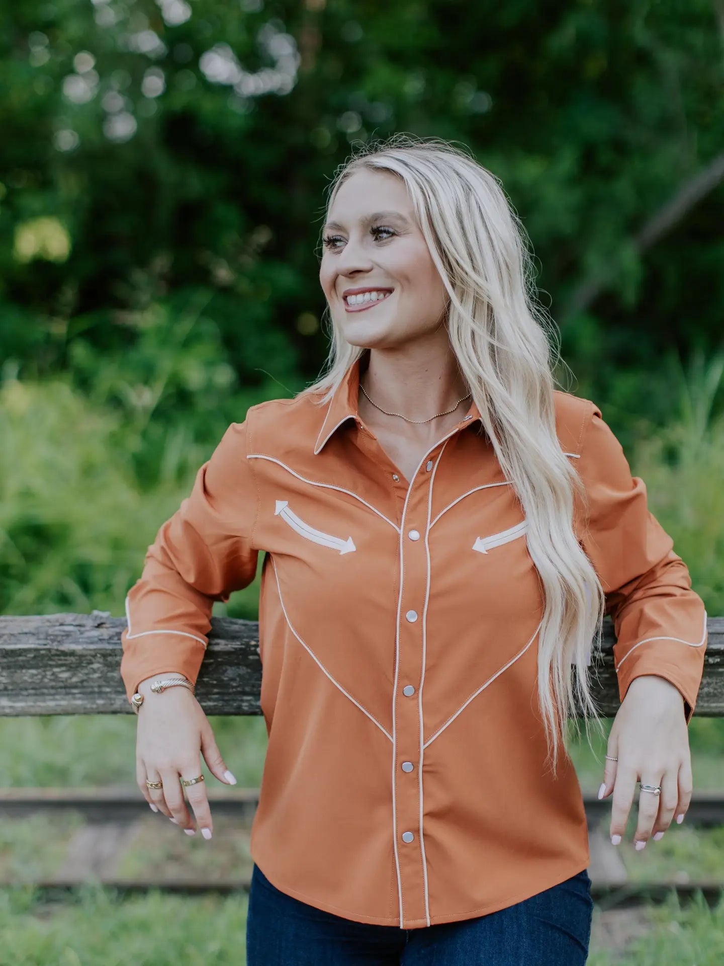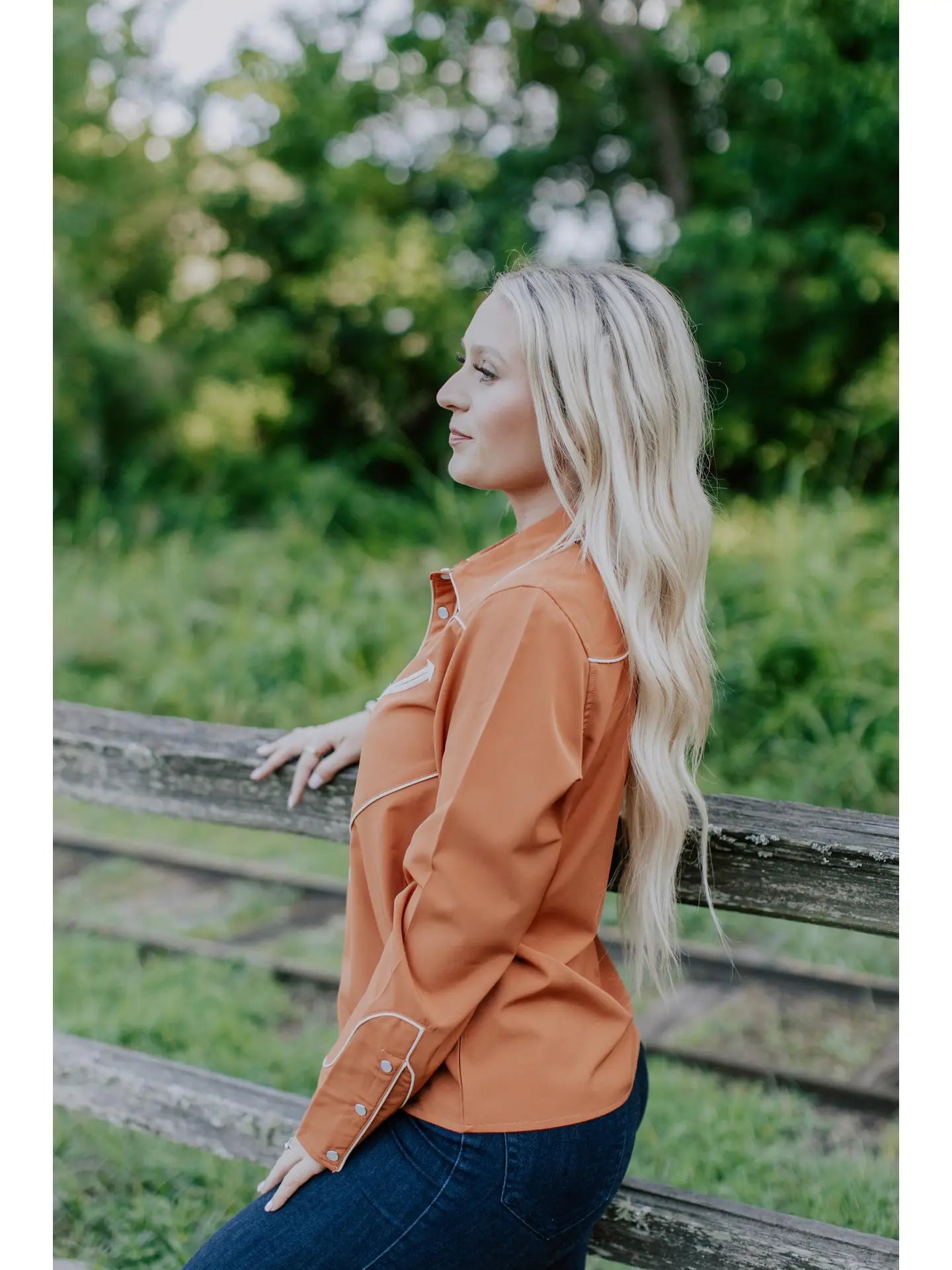 Bring a touch of rodeo charm to your everyday look with this western-inspired pearl snap shirt. Designed in a rich rust-orange with contrasting piping, it??s a modern take on a timeless classic. The yoke and arrow details give it authentic western flair, while the pearl snap closures make it as practical as it is stylish. Whether you??re headed to the arena, a country concert, or just want to add some cowboy-cool to your closet, this shirt has you covered.