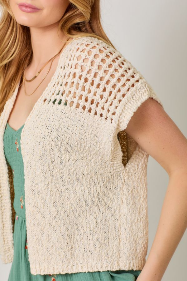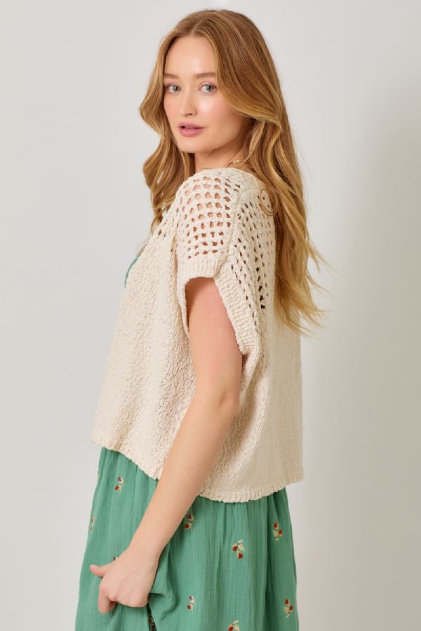 Textured knitCap sleevesRidged eyelet stitching across shoulders75% Cotton, 25% Polyester