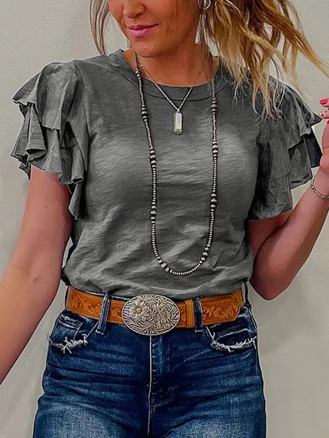 Ladies Rosa Clothing Ruffle Flutter Short Sleeve Round Neck Tee – RCJY04504