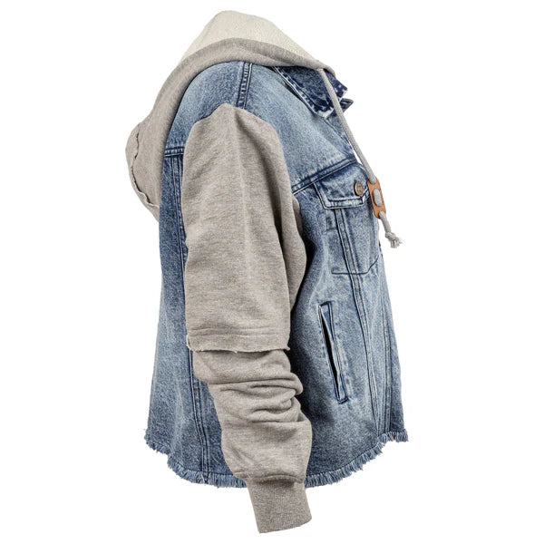 The women’s Cassie Jo is a fresh take on a classic denim jacket that will keep you comfortable all day long.Features100% cotton2 exterior button closure chest pockets2 exterior hand warming pocketsSweatshirt sleeves and drawstring hoodRibbed cuffsButton front closureOversized crop fit