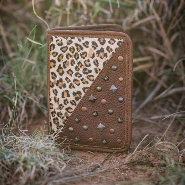 The Great Plains Magnetic Wallet features luxurious hair on hide with leopard print and copper foil accents. Finished with genuine full grain oiled and waxed leather makes this the perfect accessory for any outfit.Please note?hair on hide is a natural product and will wear under normal conditions. Each product will vary in shading, hair length and color making each item a unique product. Unfortunately, specific color requests cannot be accommodated.FeaturesGenuine hair on hide with leopard print and copper foil accents exteriorFull grain oiled and waxed leather accentsMagnetic closureMixed metal stud accents1 interior zip pocket2 interior slip pockets10 interior card slots1 interior id slot5.5″ W x 7.5″ H x 0.75″ D