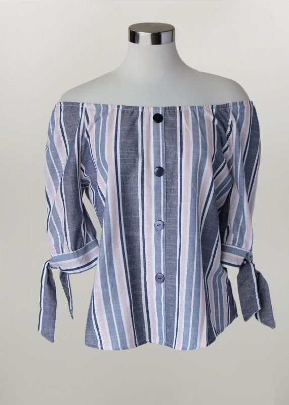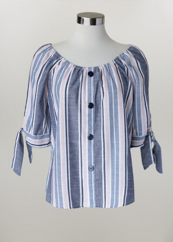 Ladies Top.? Denim White and Pink Stripe.? Button accent and tie 3/4 sleeves.? Elastic neckline.??100% CottonMachine Washable