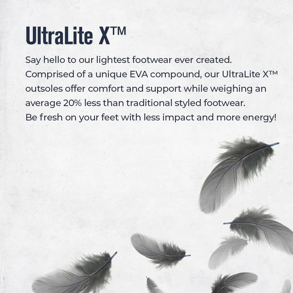 Step into effortless style and comfort with Feather X?. Tailored for an on the go lifestyle, these shoes blend functionality with a playful design that brightens up any outfit.ecoTWX? material is made from recycled plastic bottles and uses an average of 13 bottles per pair.UltraLite X? utilizes a unique EVA compound to create footwear that is on average 20% lighterElastic laces with barrel knotecoTWEED? Lining. Molded EVA footbed with ecoTWEED? Lining. ecoTWEED? material is made from recycled plastic bottles.Compression-molded EVA midsoleOil and slip resistant rubber outsole