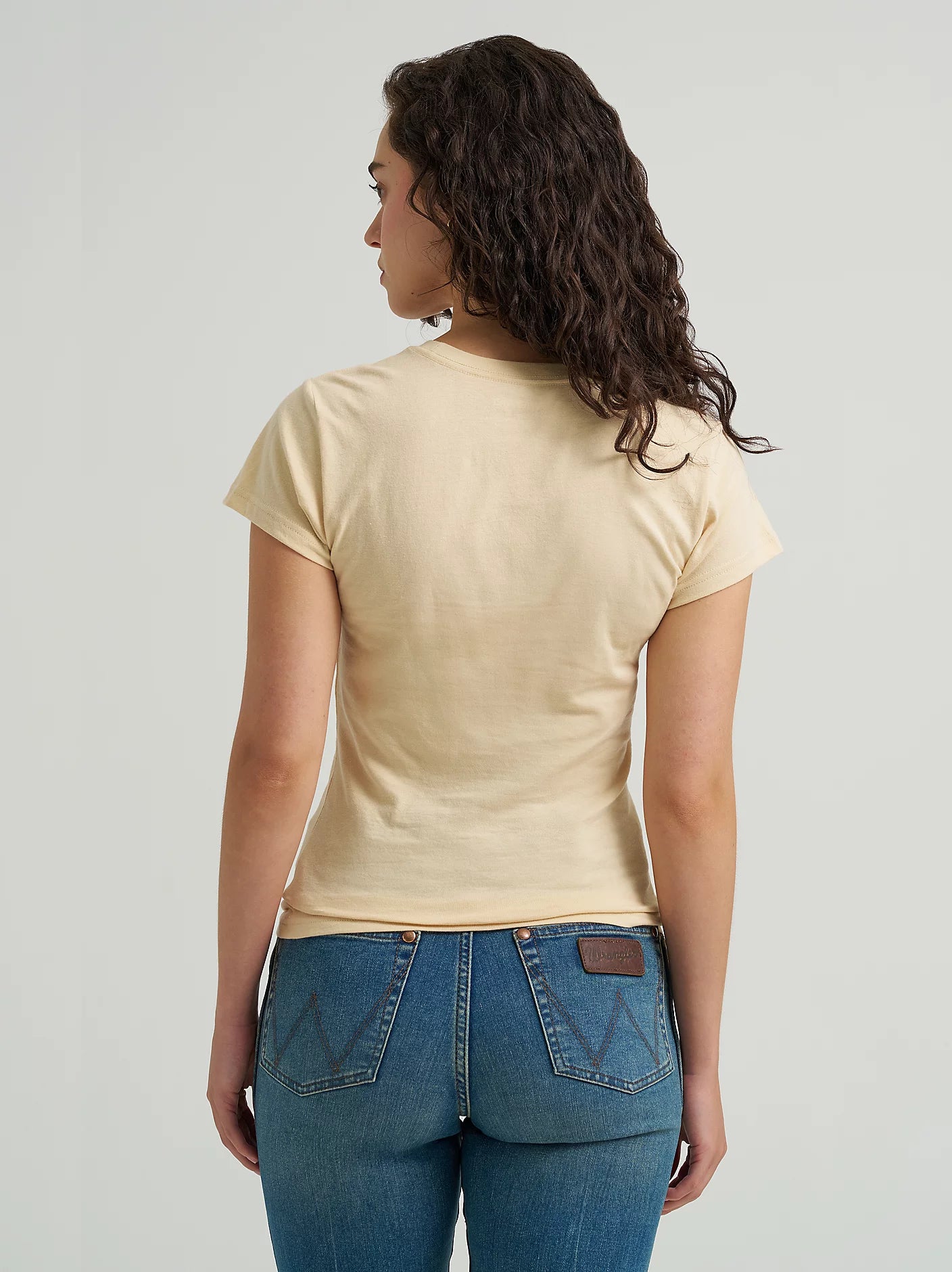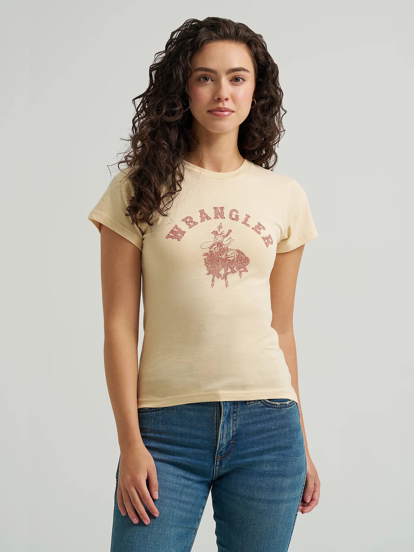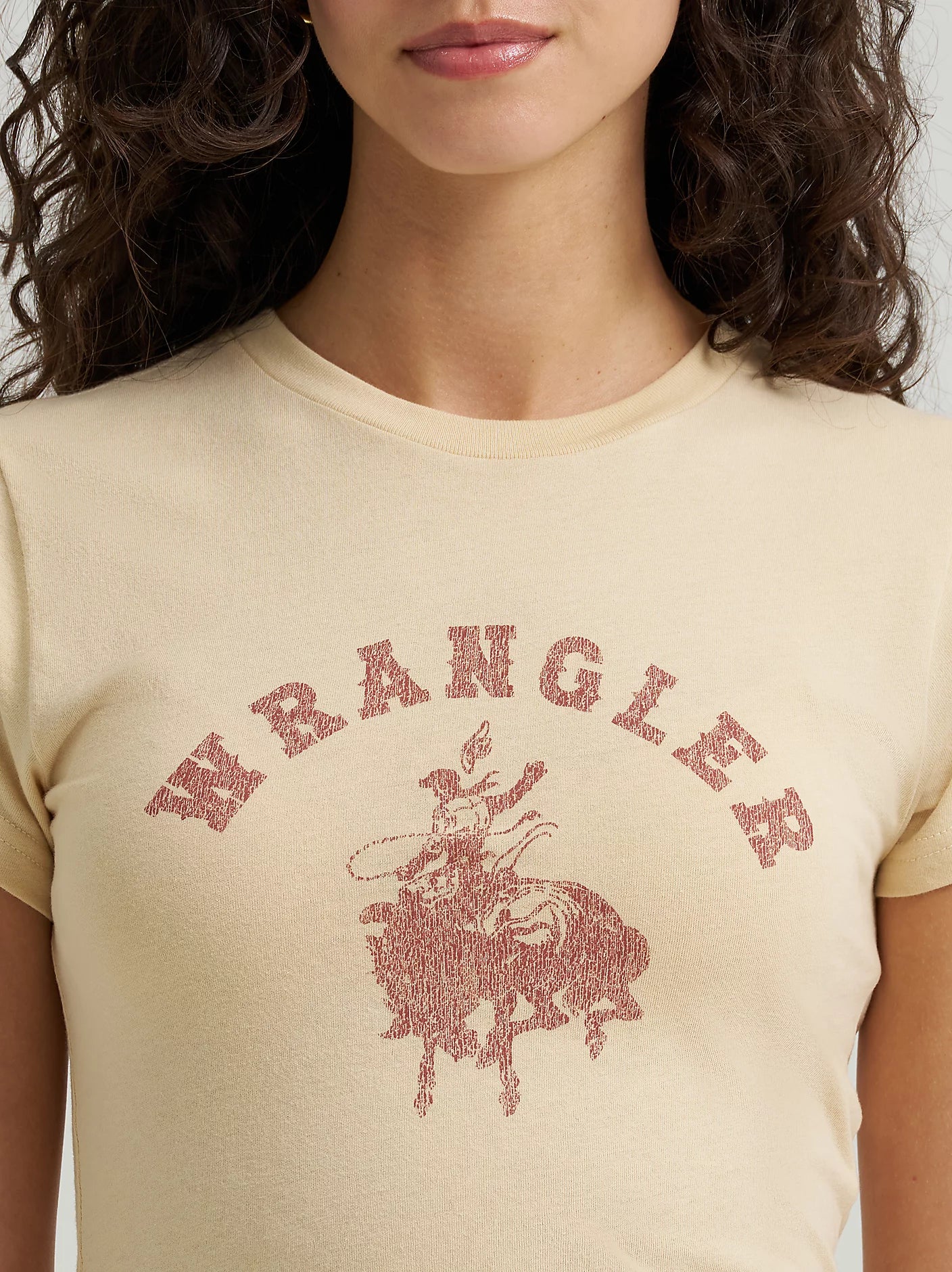 Top off your look with some extra Western attitude, starting with this shrunken tee. It??s crafted from cotton for comfort and softness that only gets better the more you wear it. It features the form-fitting look and feel of a baby tee, with a slim silhouette that hugs your shape. This tee also comes with a bold graphic print that??s perfect for a cowgirl ready to take the town by storm.?Fit:?Shrunken?Sleeve Length:?Short