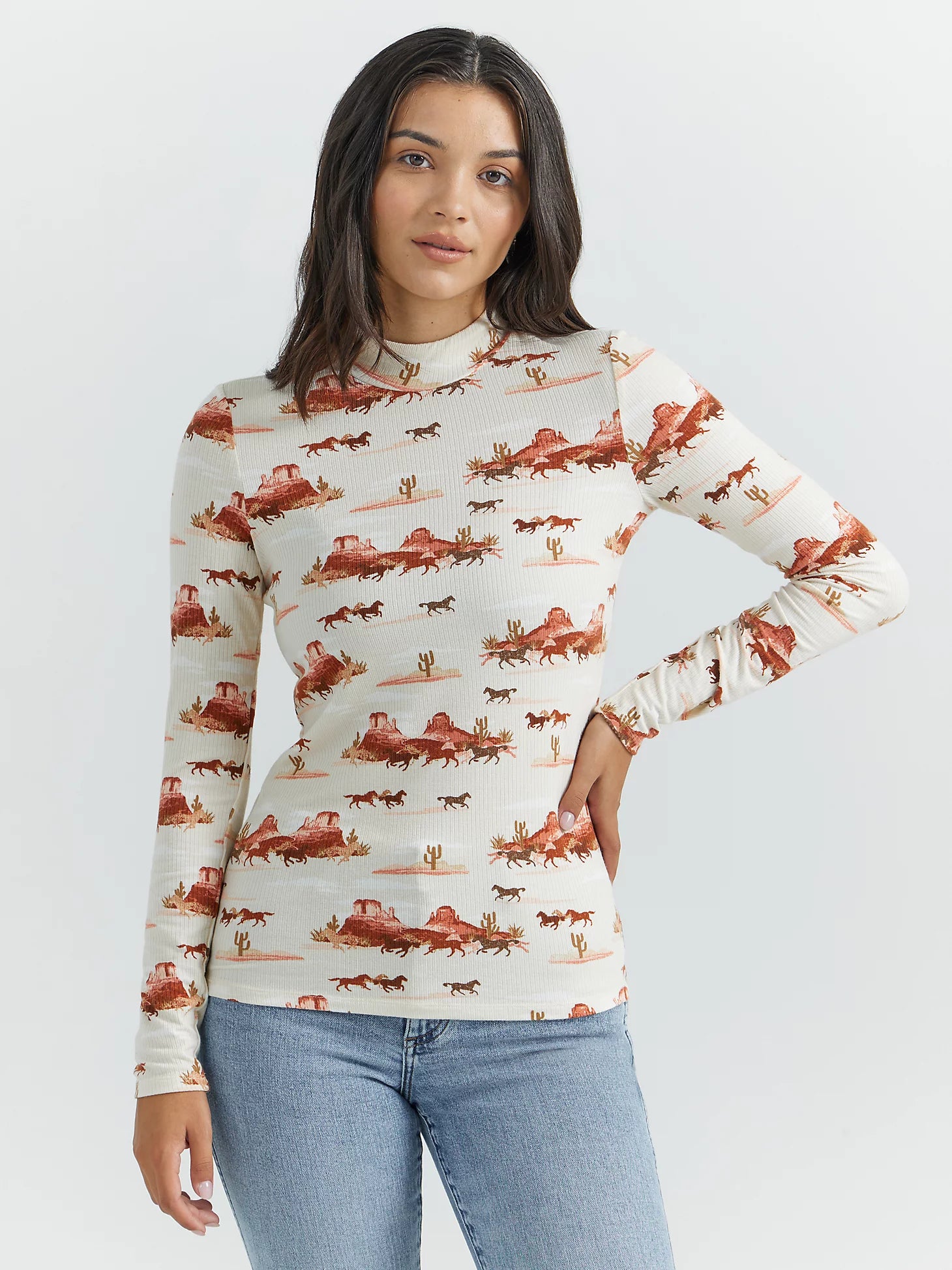 Take any outfit westward with a little giddyap from our Women??s Horse Print Mock Neck Shirt. It??s crafted from the softest fabric blend with just the perfect amount of stretch for a silhouette that hugs you in all the right places. This long-sleeve ribbed knit top comes with a colorful, Western-inspired pattern of wild horses and desert mesas.Fit: SlimSleeve Length: LongNeckline: Mock Neck
