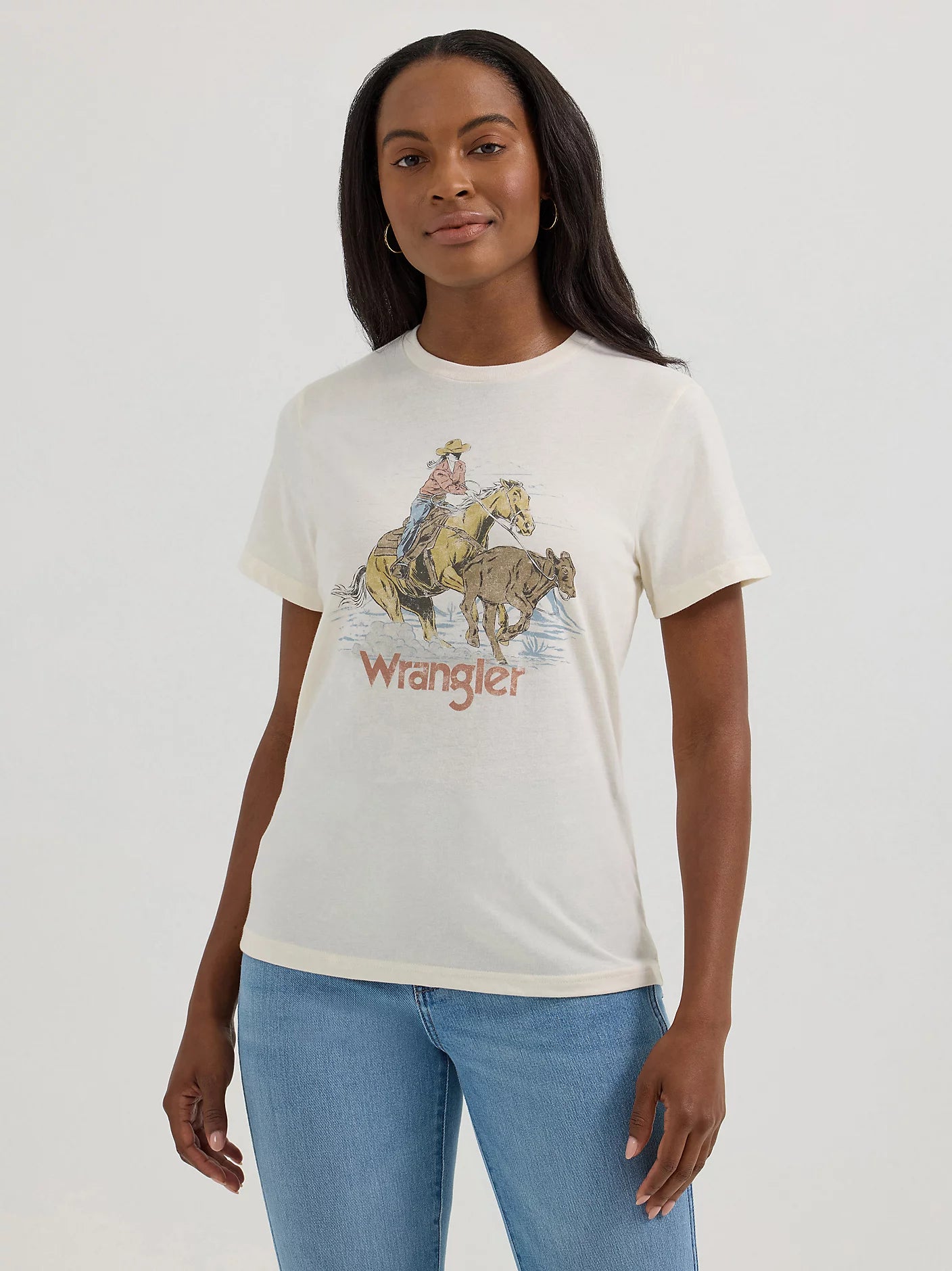 HANG ON TO THIS ONELife is the wildest ride. Our Women’s Wrangler Retro? Logo Cowboy Tee will add some Western flavor to any outfit you??re wearing. It??s crafted from a soft cotton blend to keep you comfy from dawn until dusk. It features a regular fit that??s not too tight or too loose and a retro-inspired print of a bronc rider with the classic Wrangler? logo for a stamp of authenticity.?Fit:?Regular?Sleeve Length:?Short?Neckline:?Crew Neck?Collar:?Ribbed?Color Name:?White Heather??Product ID:?112361952?Color:?White?Fabric:?50% Cotton/ 50% Polyester?Type:?Cotton Blend?Pattern:?Graphic