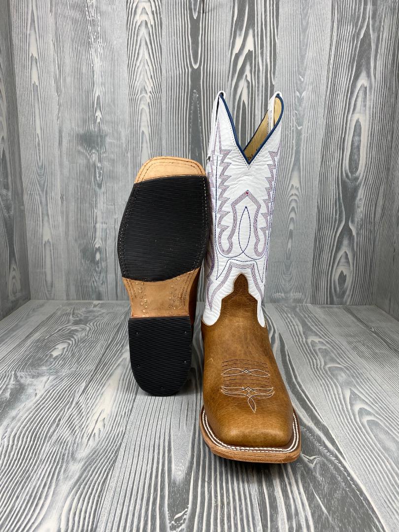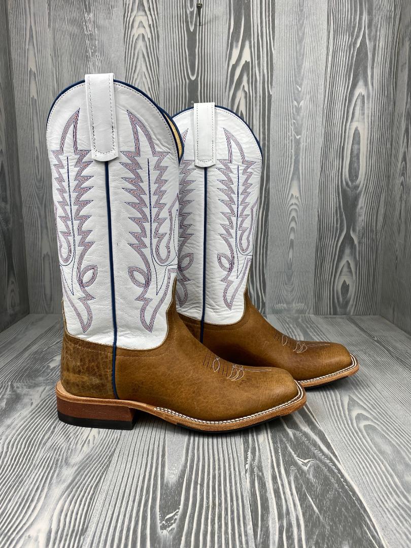 Buy it nowOur Anderson Bean exclusive boots are handcrafted and made just for us at Nigro??s Western Store. They??re truly unique! Just as diverse as the animals they come from, skin and color may vary, creating a truly one-of-a-kind pair of boots. Please note that our supply of these boots are extremely limited, so we encourage you to grab a pair before they??re gone!? Please note that there may be variations in color among each pair of boots, as the bison leather used has undergone distressing. Some pairs may be lighter or darker than others.Vamp: Distressed American Bison?Top: 13″ White Kidskin (goat)?Toe: DB (Wide Square Toe)?Removable Cush-N-Sole?DWS (Double Welt Stitch)Sole: Black Hybrid?Heel: 1 1/8″ Roper?Handmade in Mercedes,Texas?AMERICAN BUFFALO OR BISONOne of the most popular of present-day boot leathers. A full grain leather that is both soft and supple. Many customers report that it feels like it is already broken in when brand new. It takes a beating and will also shine up easily. It is a very comfortable leather for its softness. Suitable for work or dress.