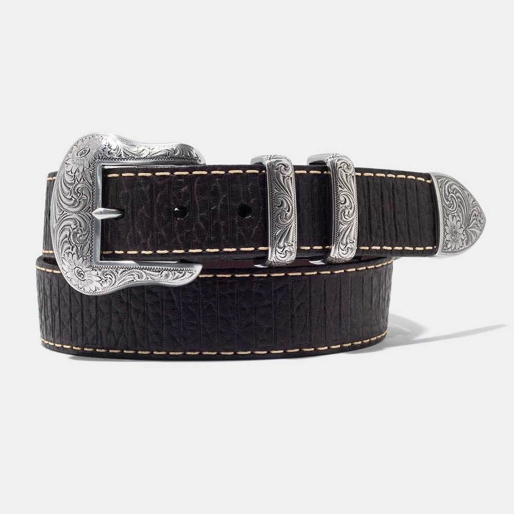 Take charge with the Wild Bill. Handcrafted in our third-generation family-owned factory, this American bison belt features silver plated buckle, keepers, and tip with Western details that add character and a healthy dose of yee-haw.American bison leatherMade in the U.S.A.?40 mm belt width (1.5 inches)5 belt holes – 1 inch apart eachSnap enclosure for easy buckle swappingColor BlackStyle# 8221