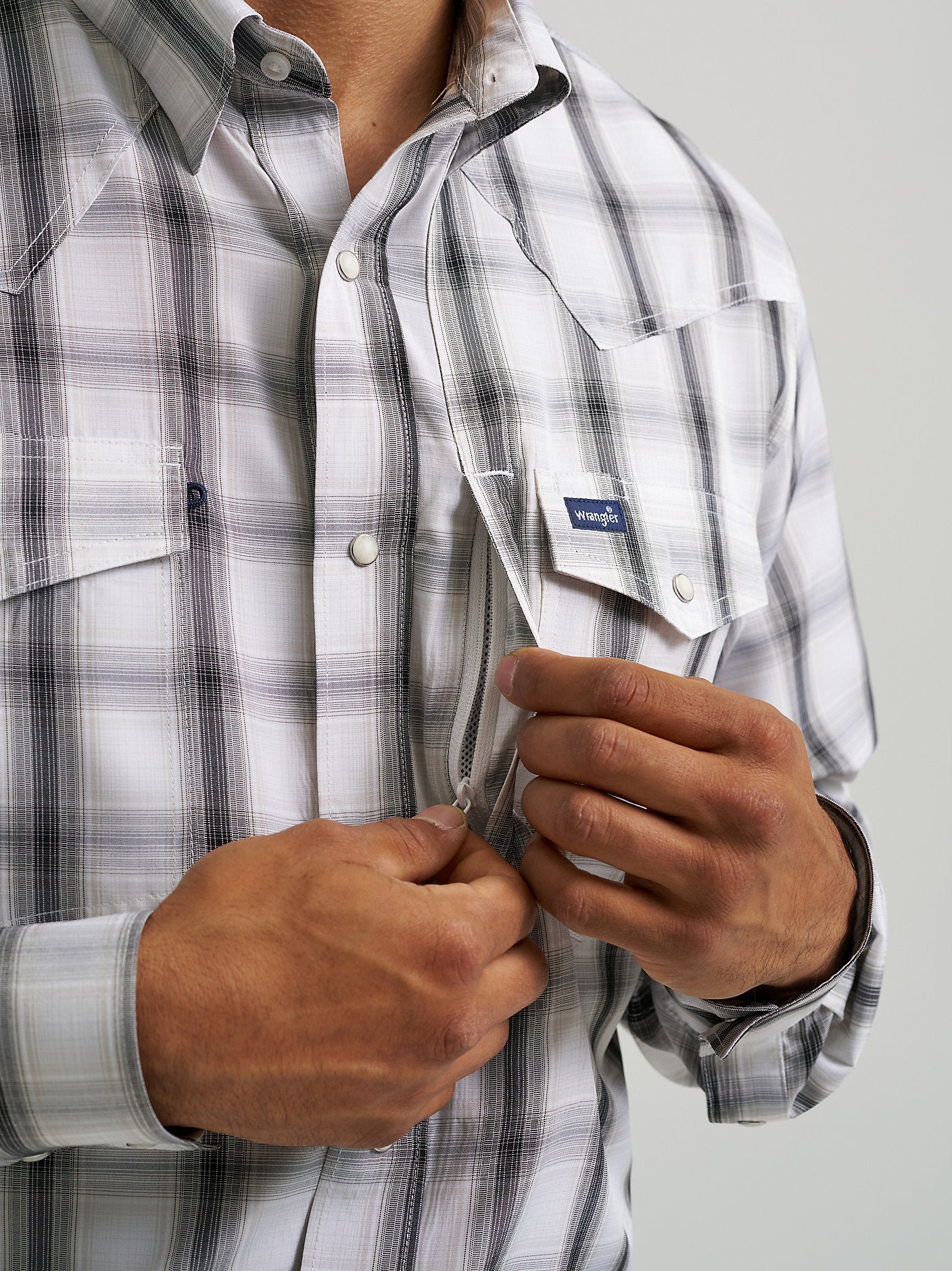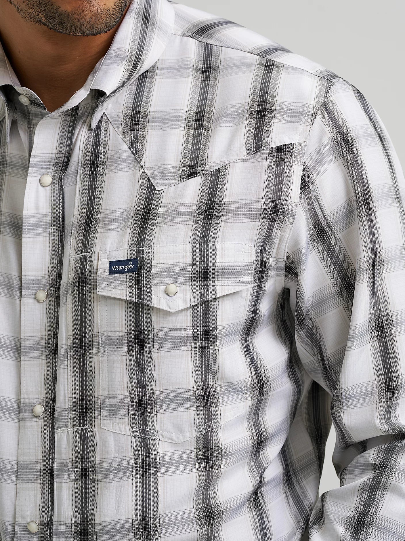 All the western styling you love and want with the performance features you need. This long-sleeve plaid snap shirt comes fully equipped with UV protection and a moisture-wicking finish to keep you protected from the elements. This classic fit shirt comes with pointed yokes and a full snap closure as well as a hidden snap-down collar to keep you looking polished and ready for whatever the day brings. A hidden back vent makes this shirt even more breathable and built-in sleeve keepers make it easy to adjust your look on the fly. Between the two chest pockets and zippered Napoleon-style pocket on the left, you??ll have plenty of storage space for your essentials. Plus, it comes with a glasses cleaner at the hem to keep you smudge-free. Wear it with your favorite pair of Wrangler Retro? or 20X? jeans to complete the outfit?Fit:?Classic?Sleeve Length:?Long?Sleeve:?Roll Tab?Front Closure:?Snaps?Front Pockets:?Four secure zip Napoleon pockets with snaps?Back:?Authentic Western Back Yoke?Collar:?Spread?Waist Hem:?Glasses Cleaner at Hem