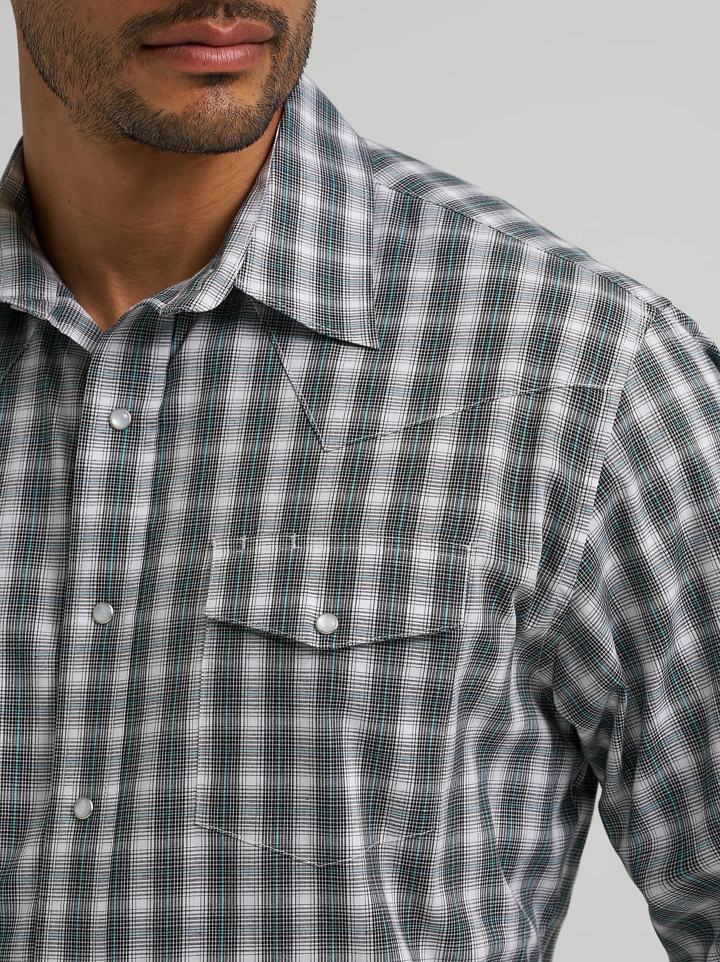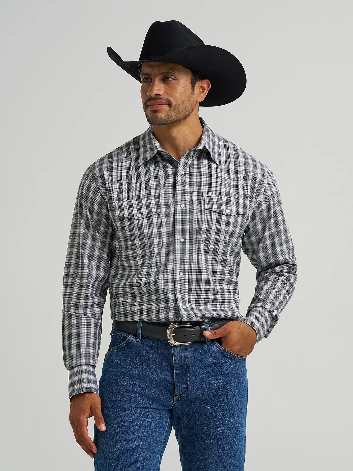 Create the sharp, crisp look you want without touching an iron. Combining the Western-style you want with the care-free maintenance you deserve, this wrinkle-resistant snap shirt from Wrangler? is a clear choice for the busy cowboy. This classic Western snap shirt comes with all the iconic features you’ve come to appreciate, including a spread collar, pointed yokes, two snap flap pockets, and a pencil slot. Best of all, this long sleeve shirt is made of a comfortable cotton blend with a little bit of stretch, stain release, and a wrinkle-free finish. Wear this wrinkle resist snap shirt with a Wrangler jean for a look that gets you out the door at a moment’s notice.?Fit:?Classic?Sleeve Length:?Long?Front Closure:?Snaps?Front Pockets:?Two with snaps?Back:?Authentic Western Back Yoke?Collar:?Spread?Cuff:?Three Snap Closure