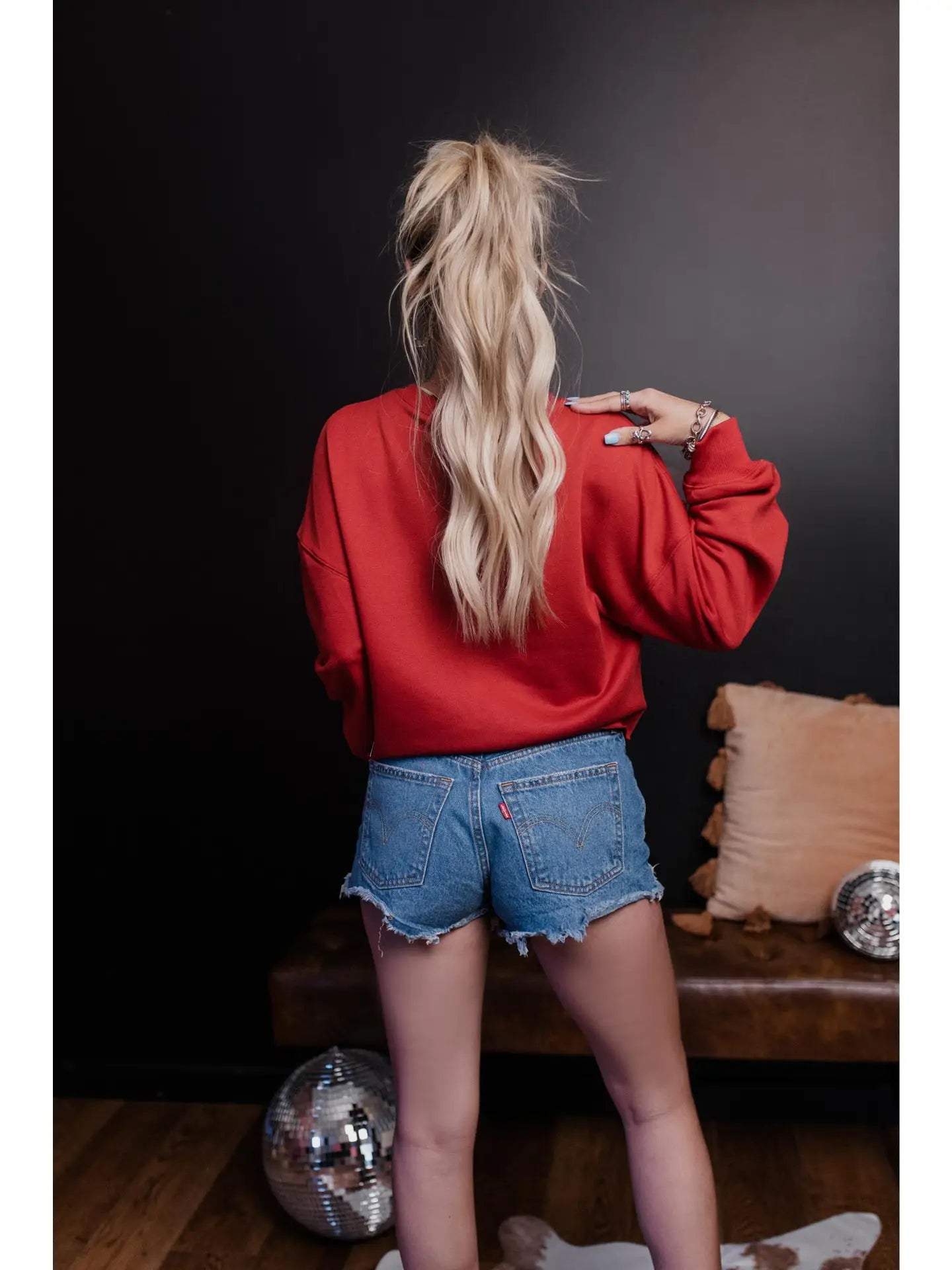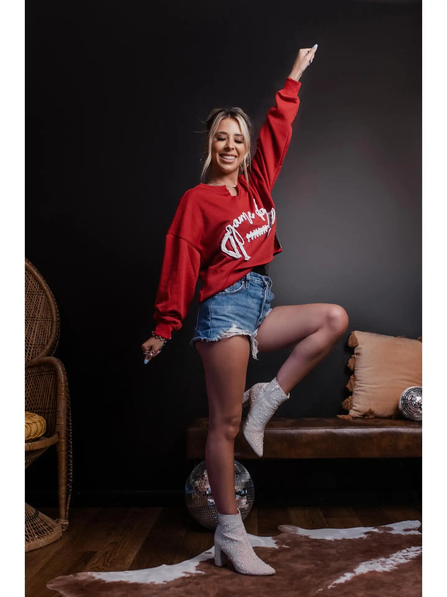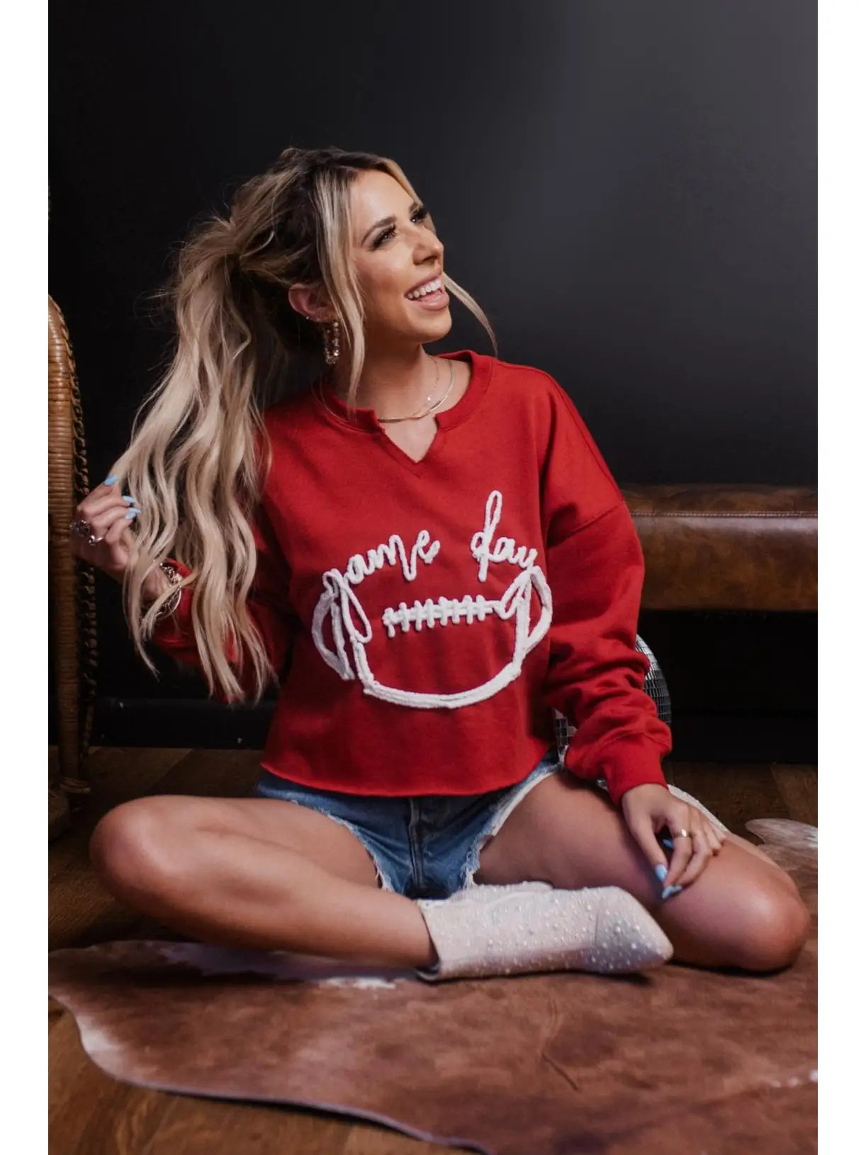Get ready for football season with our Game Day Roped Embroidery Sweatshirt?V Neck Line Long Sleeves Raw Hem Loose Fit
