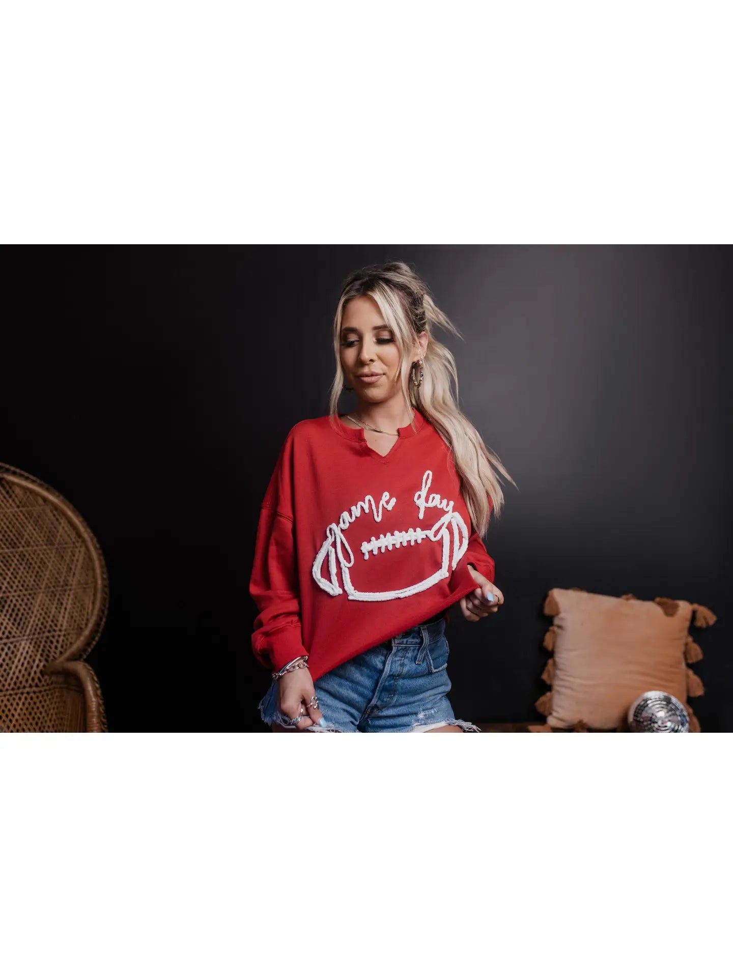 Buy it nowGet ready for football season with our Game Day Roped Embroidery Sweatshirt?V Neck Line Long Sleeves Raw Hem Loose Fit