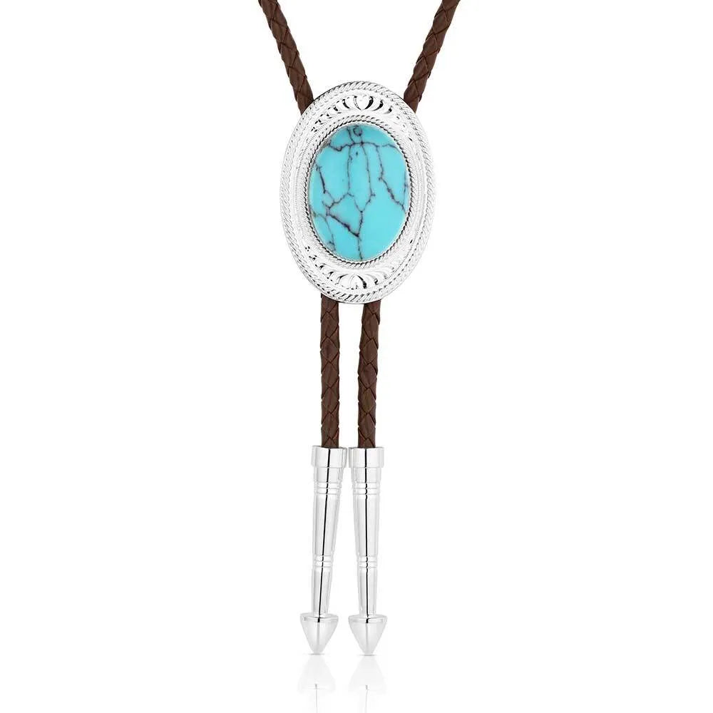 Made for the ones who go against the grain. The Outlaw Turquoise Bolo Tie has a silver tone oval base that has bright cut engravings that frame the center turquoise stone. The brown braided leather cord is weighed with two silver arrow pointed tips to complete the bold design. Stone color will vary.Dimensions Width 1.5 Height 2.0 Length 36.0Materials: Silver over brass. Crafted turquoise. Genuine leather. Montana Armor to prevent tarnish.All Montana Silversmiths jewelry and accessories have a limited lifetime warranty on manufacturing defects when accompanied by a receipt.