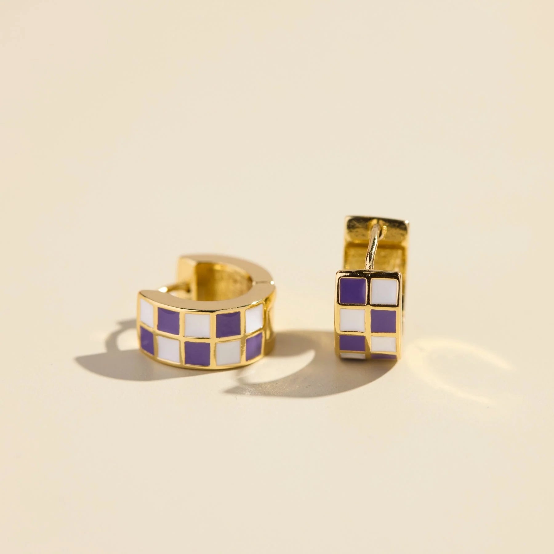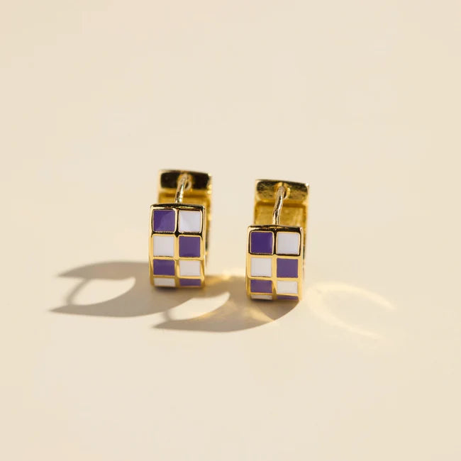 The purple and white checkered enamel huggies are a wide, small gold hoop with purple and white enamel that fits closely to the ear. They feature a hinge closure for comfort and wearability.