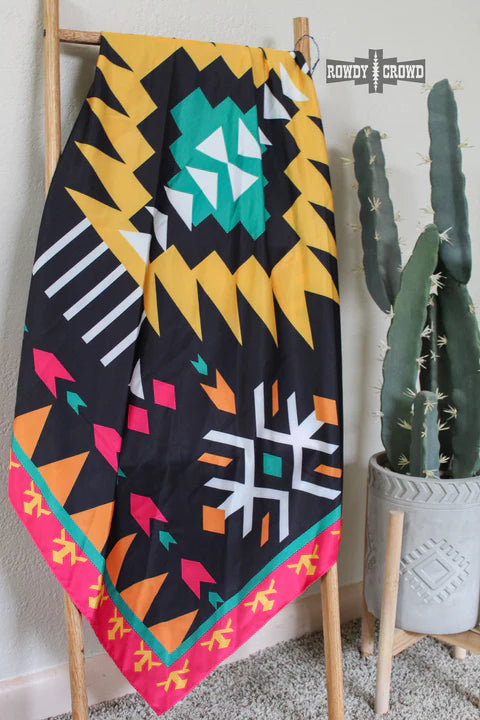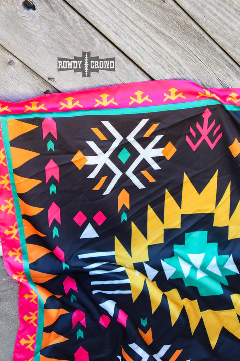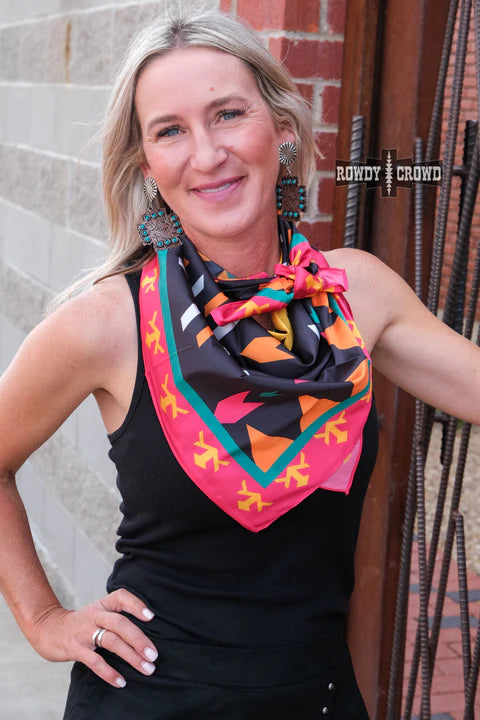 The Solomon Wild Rag is a brightly colored, beautiful aztec print accessory. This wild rag can be styled in a multitude of ways that will be sure to show off your personal style. Its bright pink, turquoise, yellow, and orange colors are sure to turn heads. It measures 36″x36″ and is made of 100% Polyester.