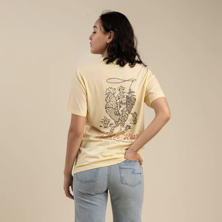 Ever seen a cowboy ridin?? a giant chicken? No? Neither have we, but we dreamt it up and it looks ??official?? Western if you ask us.Ultra Soft 60% Organic Cotton/40% Polyester Blend?Soft Touch Screen PrintScreen Printed Inside Label?Reinforced Neck Seam Tape?Sendero Woven Labels