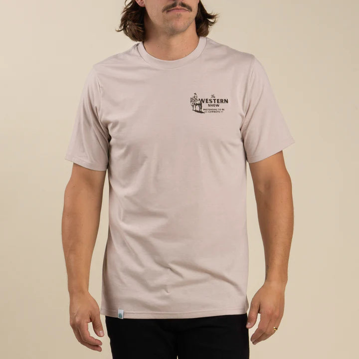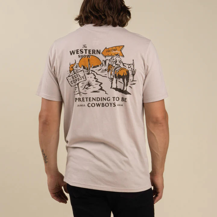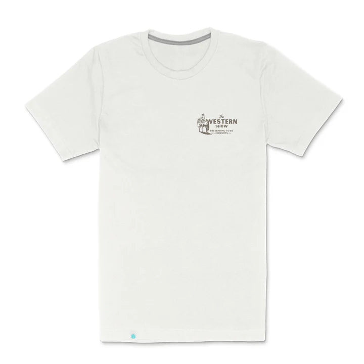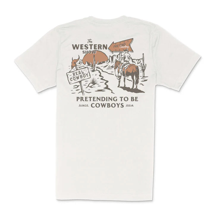 The road has been long and hard for this ol’ cowboy, but he paces?onward across the dusty plain.?Carved by his own grit and determination, the path?leads on… through the dust, past the bones of those?who didn’t make it, and towards the proverbial never ending sunset. The cowboy’s tired. Not sure he can keep it up anymore……. His time has run out………. So he quits pretending and turns back! Time to take his giddy-up horse back to the stall cause the trail ride’s over. He changes out of his rental coveralls, puts his skinny jeans and vintage Western shirt he scored off eBay back on, and slaps?on the ol’ blue light glasses to head to the coffee shop for a turmeric mylk latte?and watch some Spaghetti Westerns. He’s going to plan a DOPE John Wayne tattoo today.?Ultra?Soft 60% Cotton/40% PolyDreamed Up In TejasWoven Label Pocket TeeScreen Printed Inside Label