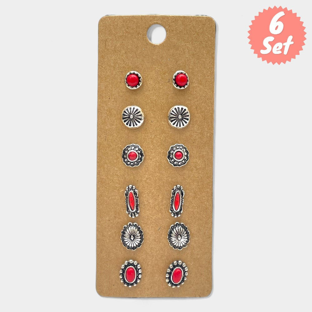 Set of 6 Western Metal Concho Red Stone Post Earrings – F