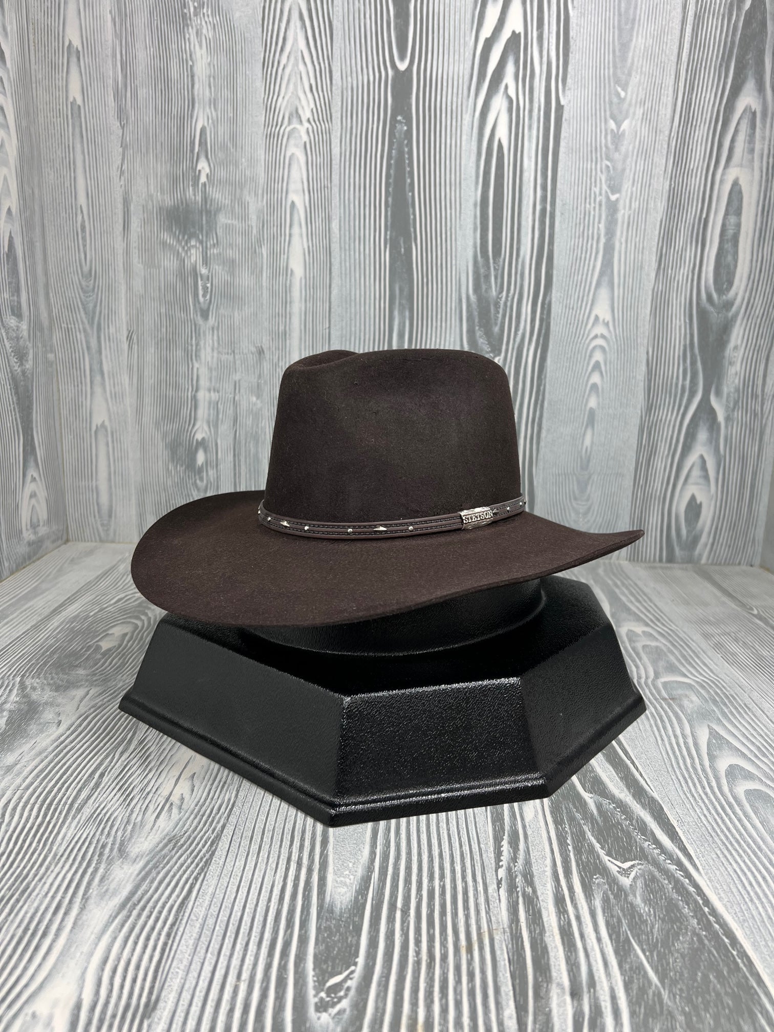 Stetson Pawnee Chocolate 5X Felt 3 1/4″ Brim Gun Club Collection??The Pawnee, from Stetson’s Gun Club Collection, is a handsome 5X rabbit fur blend hat that features a 4 1/4″ pinchfront crown with a profile 40. There is a 3 1/4″ brim, and a leather hat band with accents and metal studs.?Stetson Pawnee?5X fur Felt?4 1/4″ Crown, Pinch front?3 1/4″ brim?Leather Sweatband