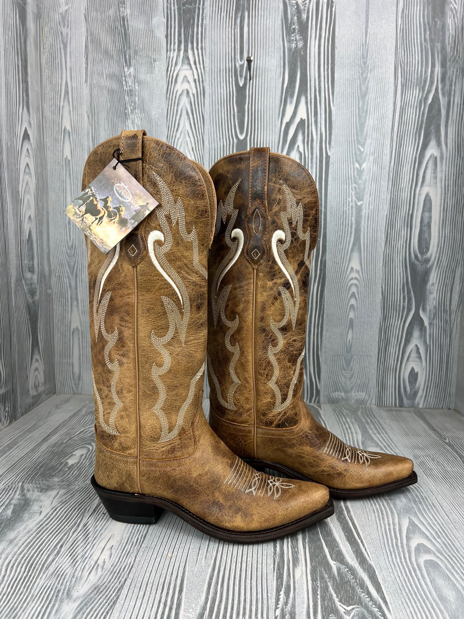 Women’s Oldwest Tall Tan Snip Toe Western Boot – TS1549??Foot: Tan Cowhide with Fancy Stitch?Upper: 14″ Tan Cowhide?Toe: Snip?Leather Outsole?Heel: 2″