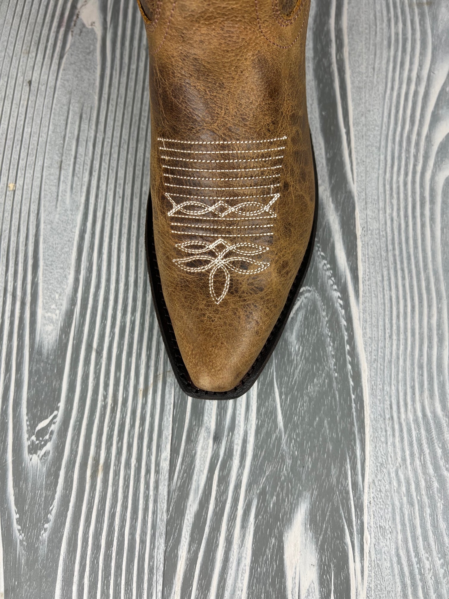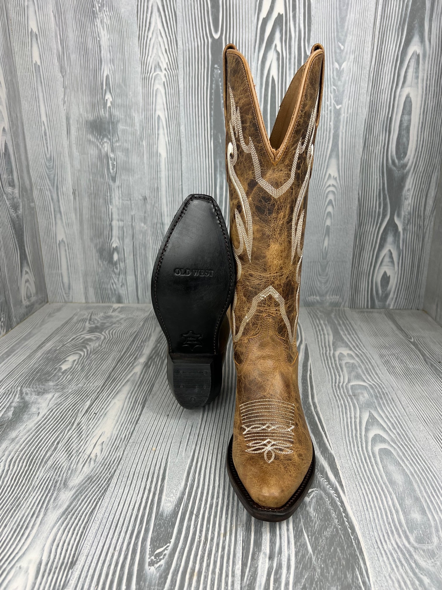 Buy it nowWomen’s Oldwest Tall Tan Snip Toe Western Boot – TS1549??Foot: Tan Cowhide with Fancy Stitch?Upper: 14″ Tan Cowhide?Toe: Snip?Leather Outsole?Heel: 2″